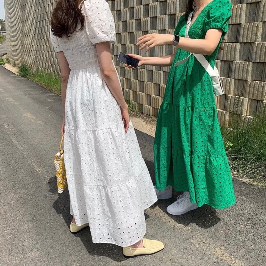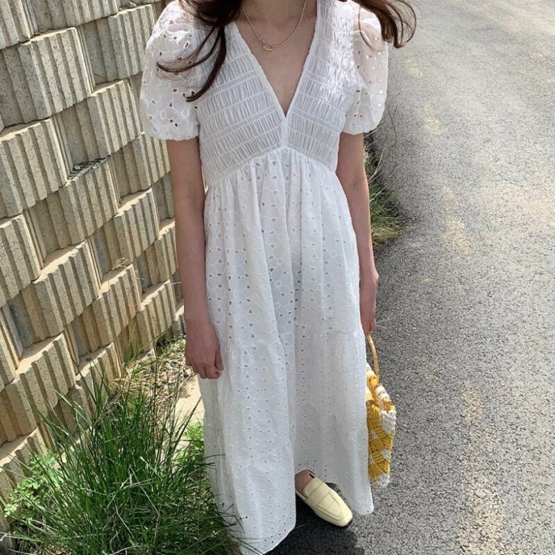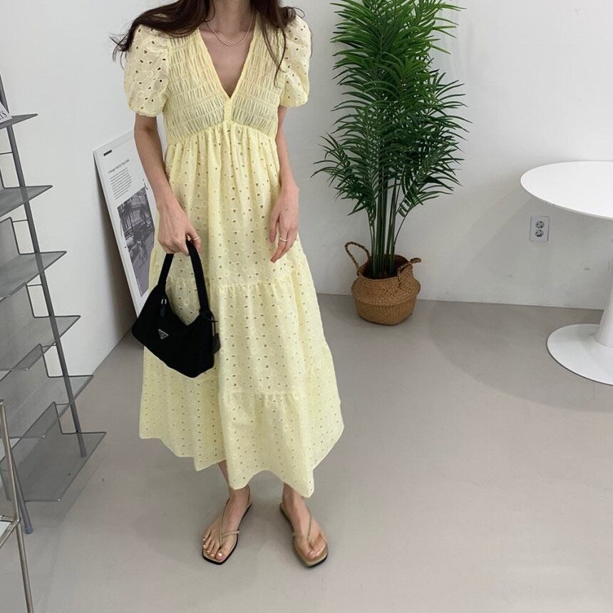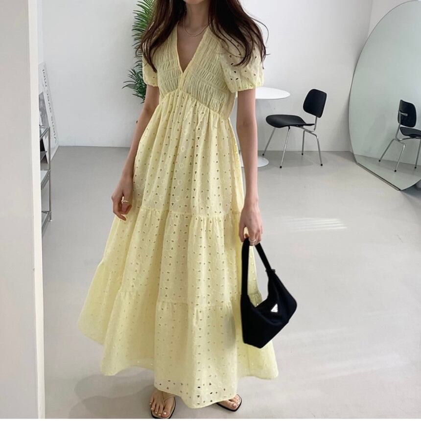 サマープリーツVネックウェストレースロングドレス レディース 夏物 韓国婦人26245084445
