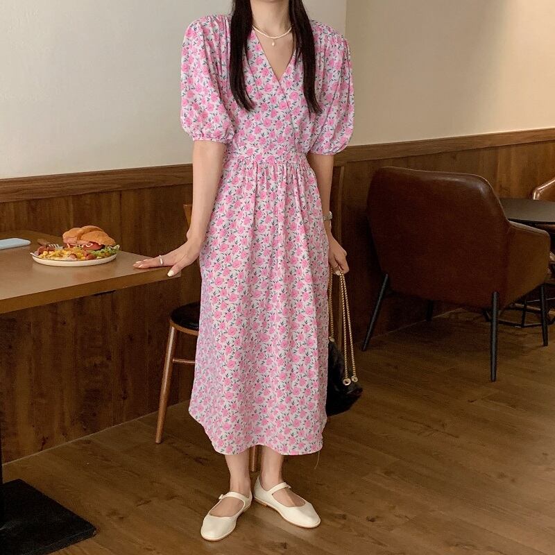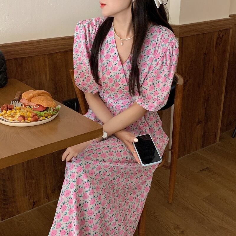サマーフローラルホワイトVネックレースポケットスリーブドレス ロングスカート ピンク 大人ガーリー スウィート キュート カジュアル 夏物 花柄 韓国婦人88124706767