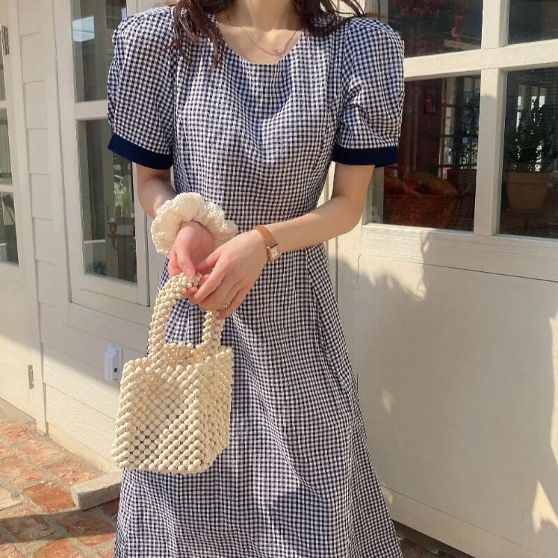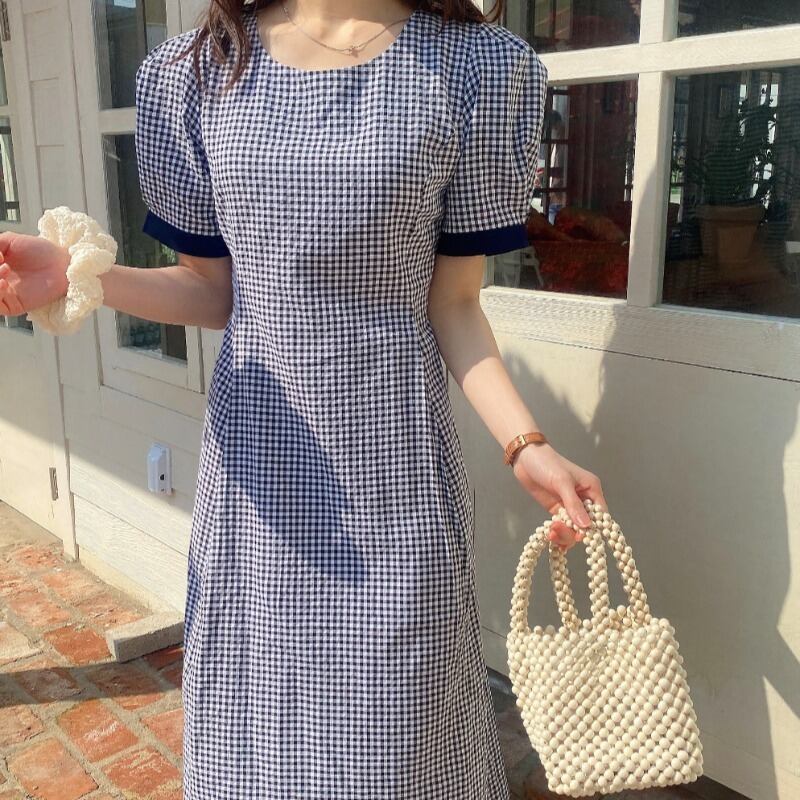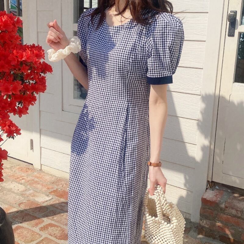 スタンダードカラーウェスト格子柄ドレス サマースカート レトロ 夏物 韓国婦人84384900543