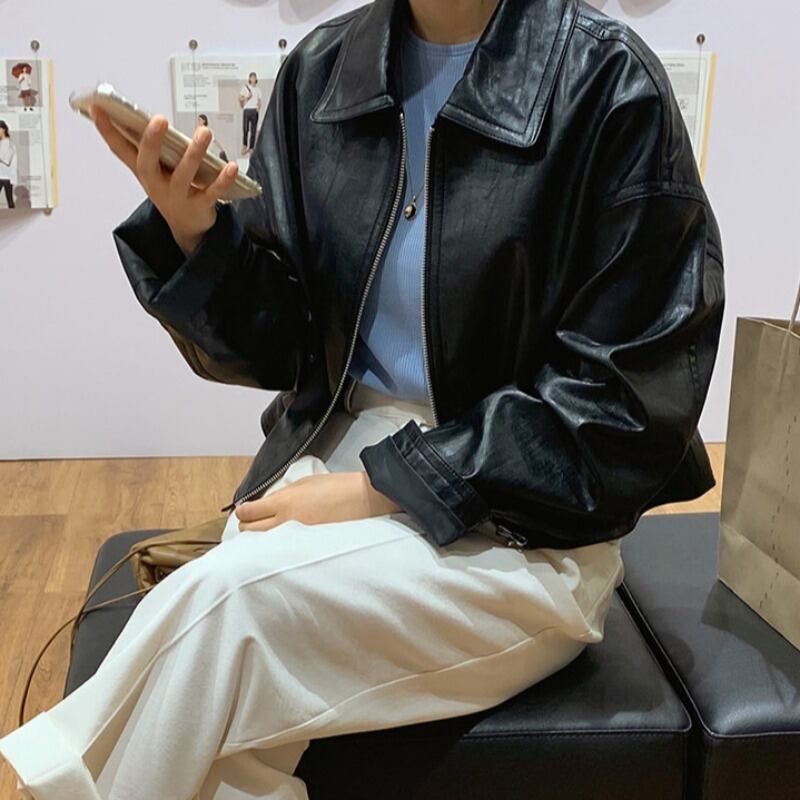 オータムウィンターカジュアルルーズショートジッパーレザージャケット カーディガンレディース 秋物 冬物 韓国婦人8577896425