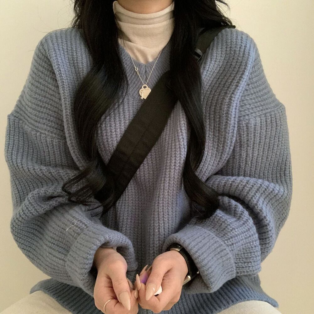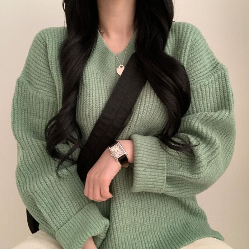 ウィンタースタンダードルーズVネックソリッド カラーセーター レディース レトロ 冬物 ソリッドカラー 韓国婦人11270220410