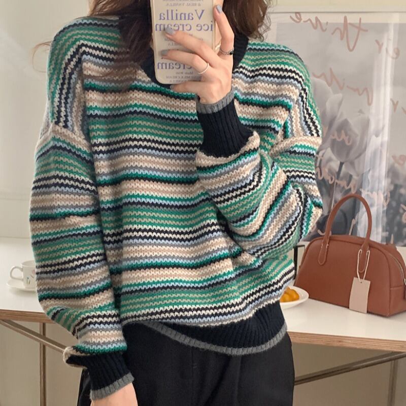 ウィンタースタンダードスタイルルーズ薄手カラーストライプセーター レディース レトロ 冬物 韓国婦人30825917076