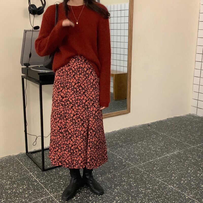 オータムウィンタースタンダードルーズソリッド カラーニットセーター ハイウェストウェストフローラルスカート レディース レトロ 秋物 冬物 花柄 ソリッドカラー 韓国婦人42494375338