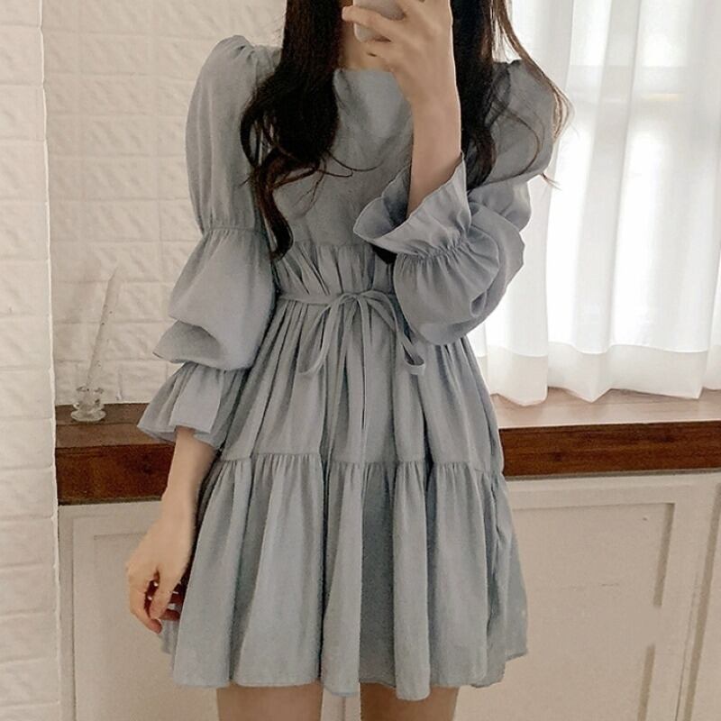 スプリングサマーウェストラウンドネックショートドレス レディース 大人ガーリー スウィート キュート カジュアル 春物 夏物 Oネック 韓国婦人86660924982