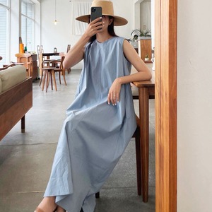サマーラウンドネックソリッド カラーロングノースリーブドレス レディース 長袖 夏物 Oネック ソリッドカラー 韓国婦人77011489151