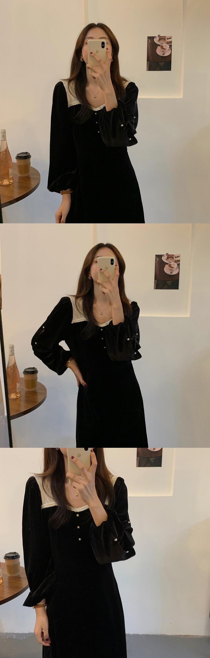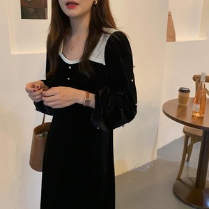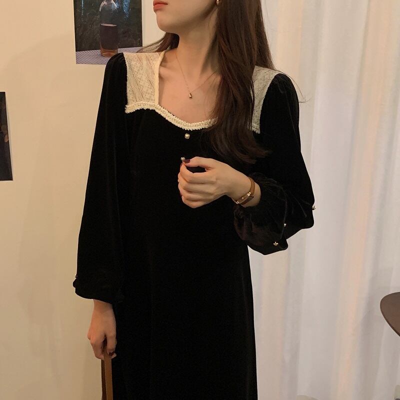 オータムスタイルカラーレースウェストロングベルベットドレス スカート レディース 秋物 スクウェア 韓国婦人68030367202