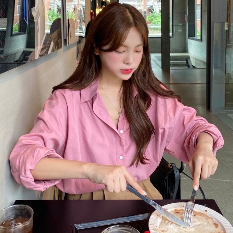 オータムスタイルルーズシャツ ブラウス レディース ロング ピンク 秋物 韓国婦人80032889432