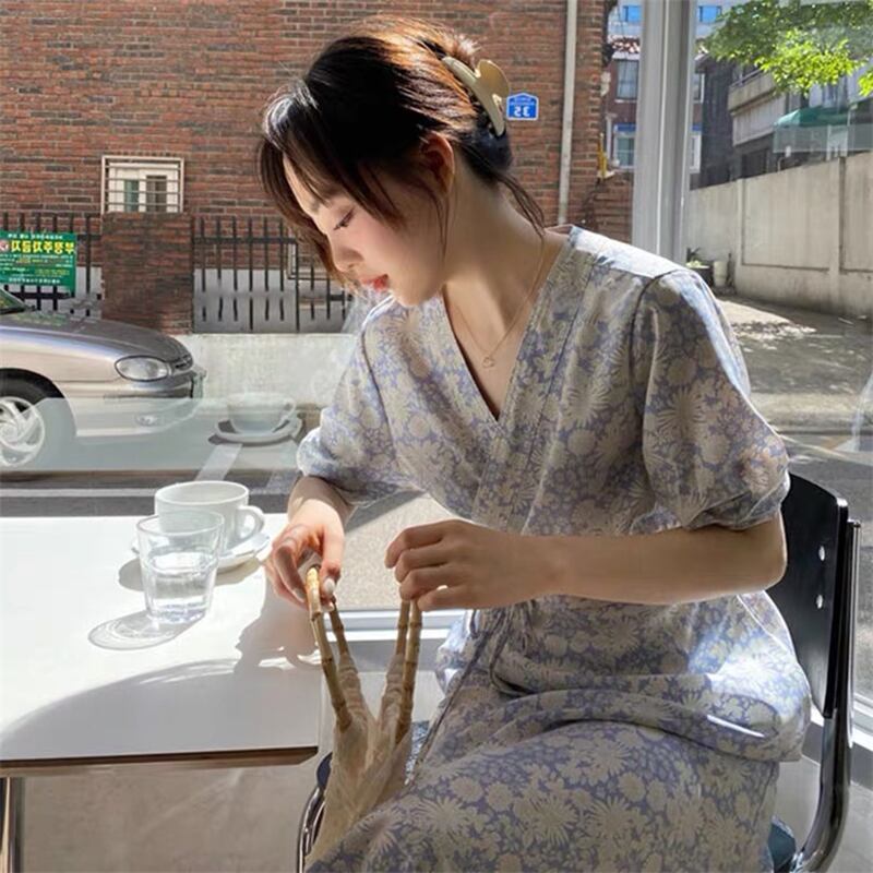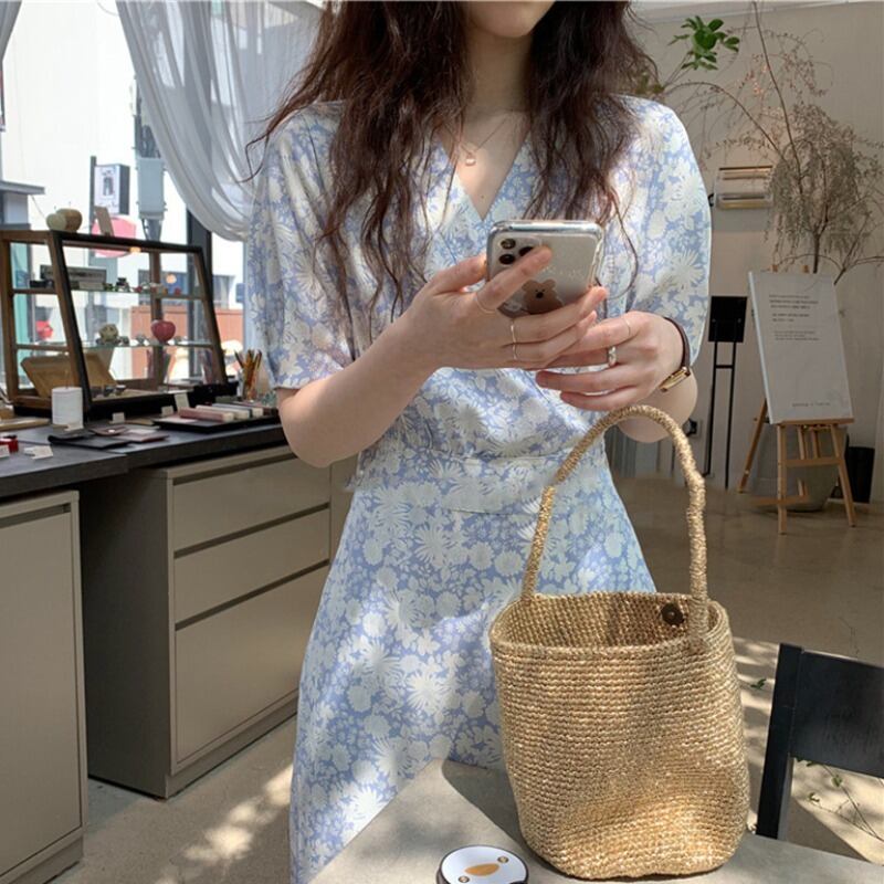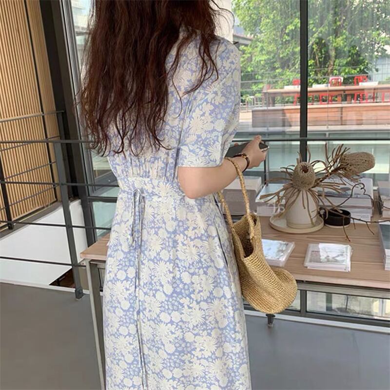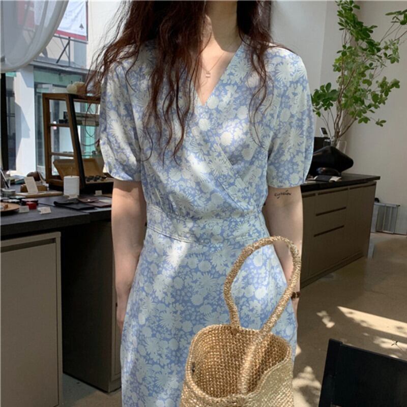 ブルーフローラルドレス Vネックウェストロングスカート 花柄 韓国婦人8449620275