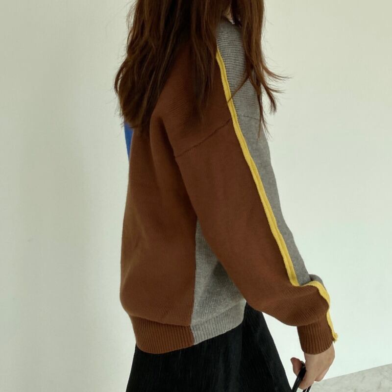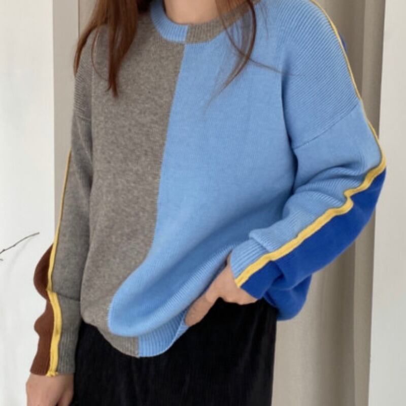 オータムウィンタースタンダードカラールーズラウンドネックプルオーバー 長袖スリーブニットセーター レディース ロング レトロ 秋物 冬物 Oネック ステッチ 韓国婦人12034132980