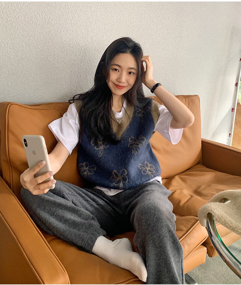 オータムウィンタースタンダードスタイルカラーVネックショートニットレディース レトロ 秋物 冬物 フラワーデザイン 韓国婦人93840592941