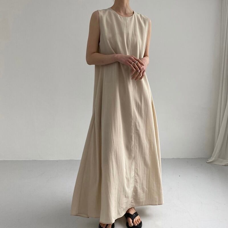 サマーミニマリストスタイルラウンドネックダブルポケットルーズノースリーブドレス ロングスカート レディース 夏物 Oネック 韓国婦人24972566204