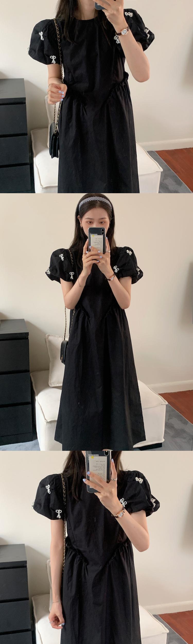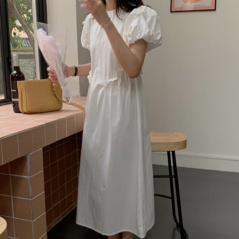 サマースタンダードスタイルパールリボンスリーブドレス ロングスカート レトロ 夏物 真珠 韓国婦人14084764630