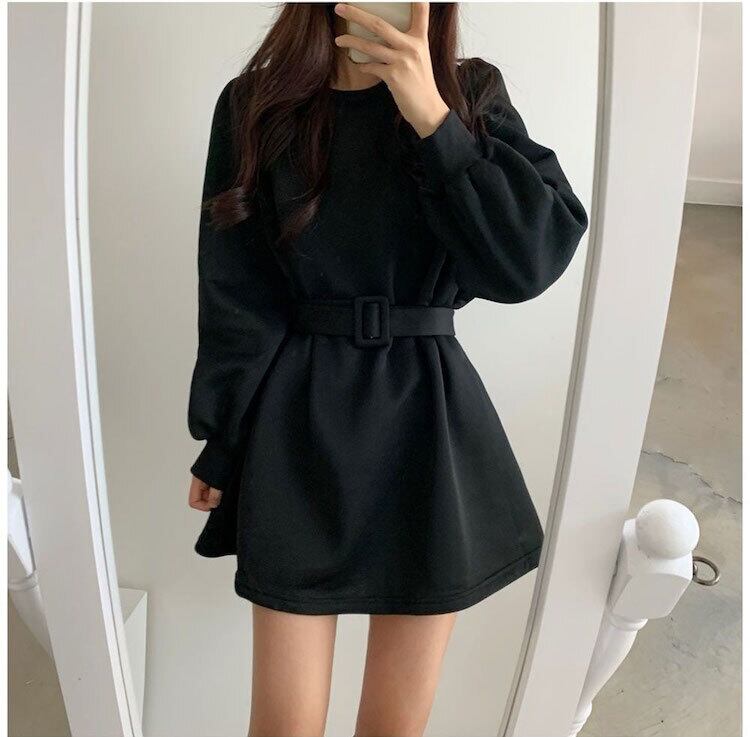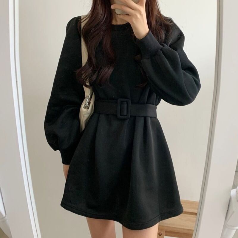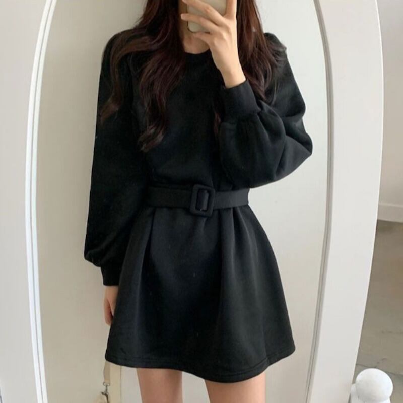 オータムカジュアルルーズラウンドネックベルベットドレス ベルト ロング コットン 秋物 ハーネス Oネック 韓国婦人23821394687