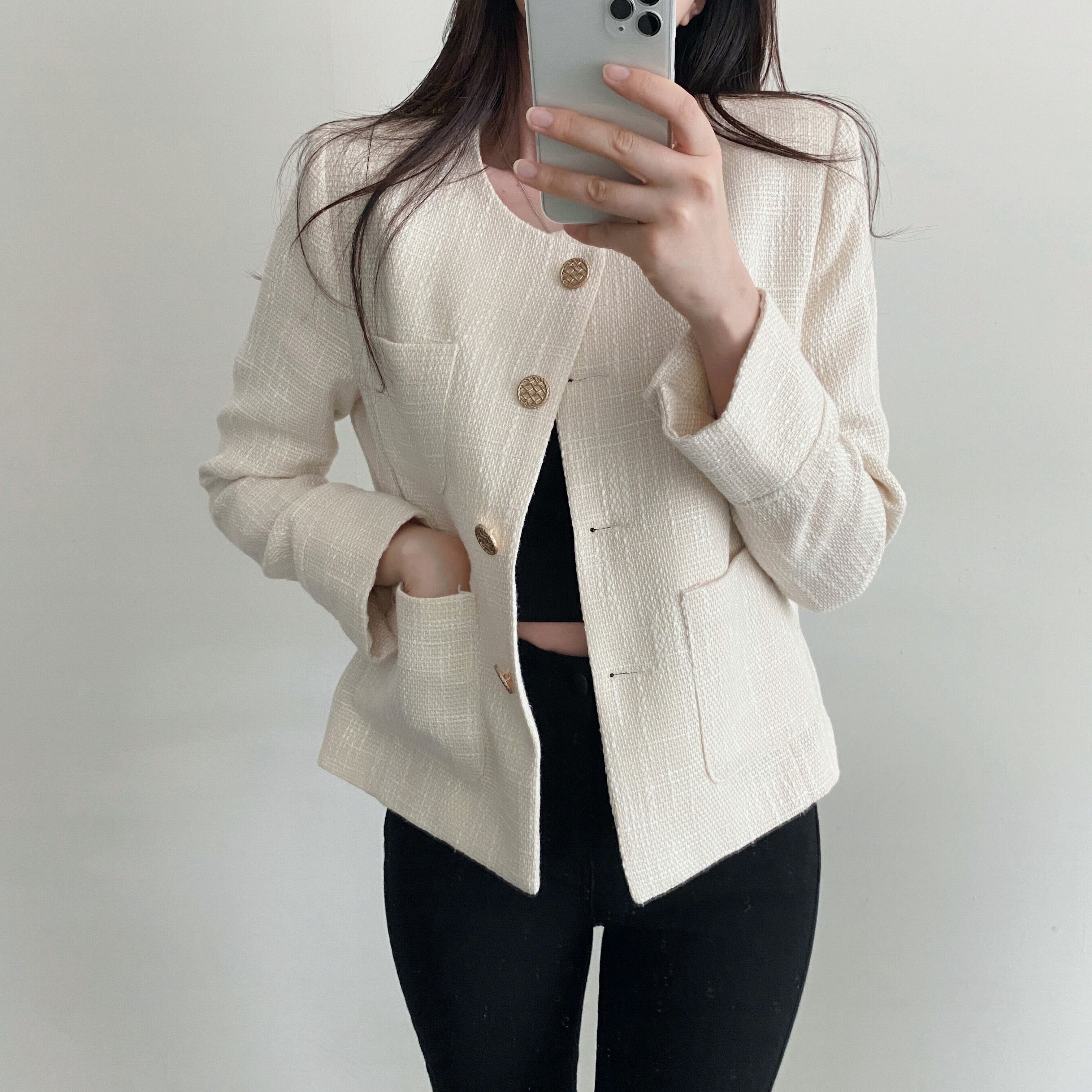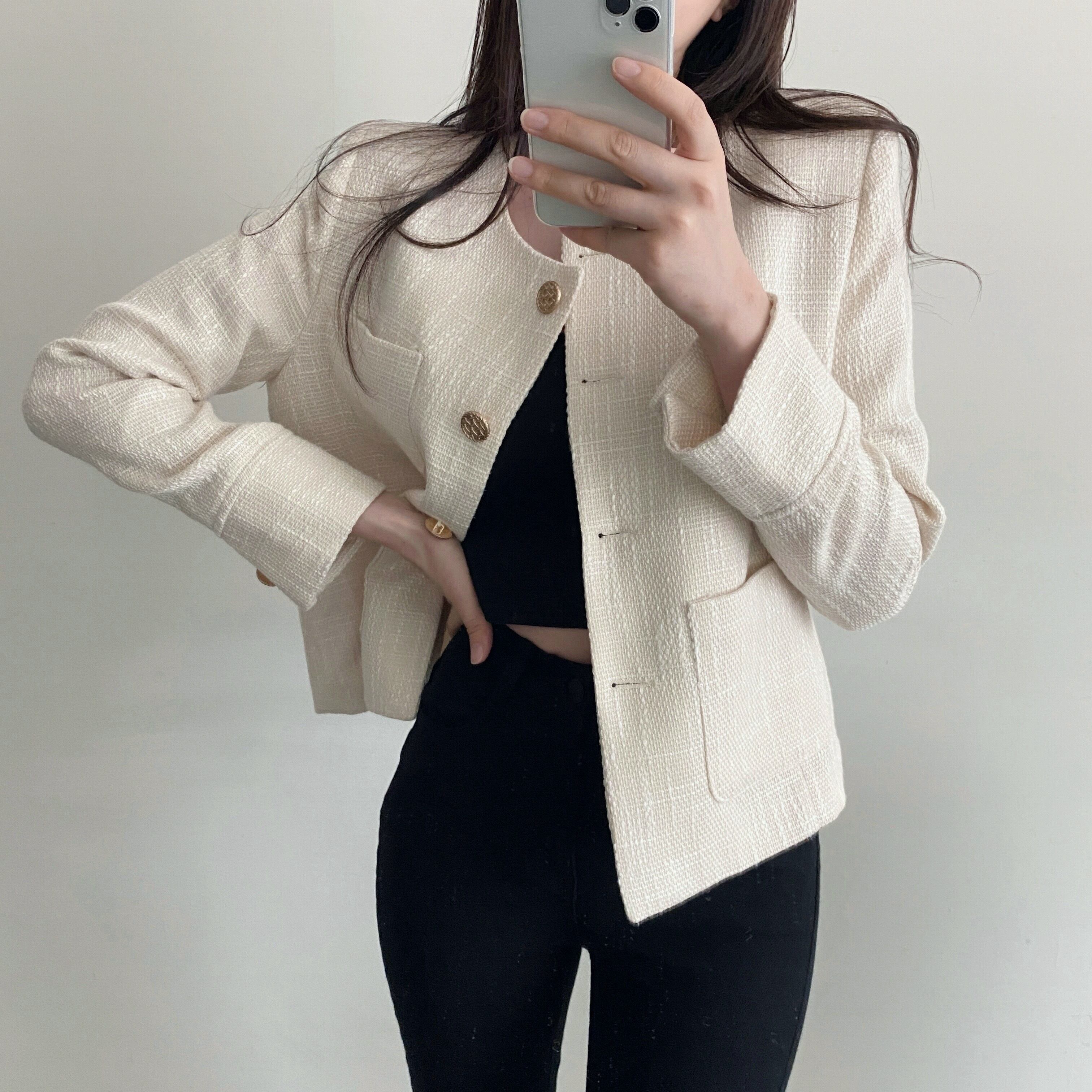 オータムウィンターラウンドネックカジュアルショートコート カーディガンレディース 秋物 冬物 Oネック ポケット多め マルチポケット 韓国婦人78092819390