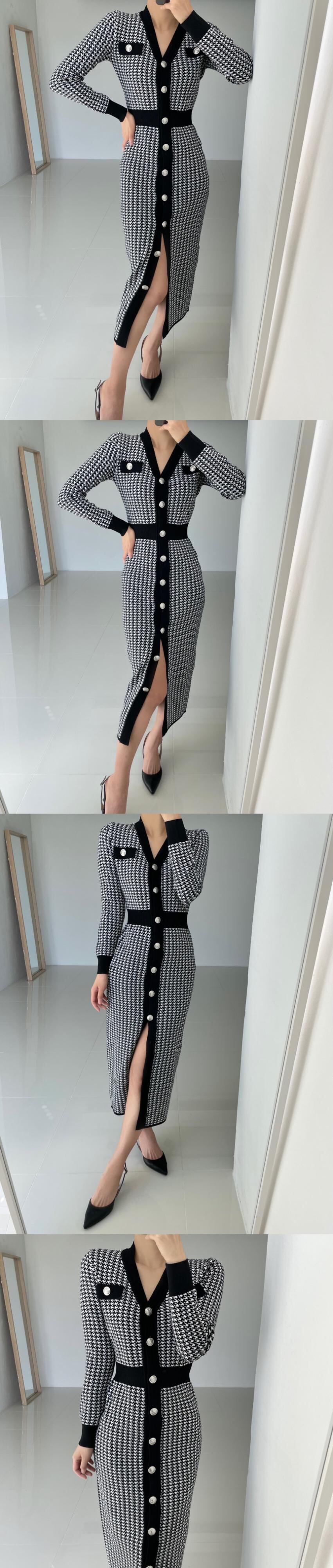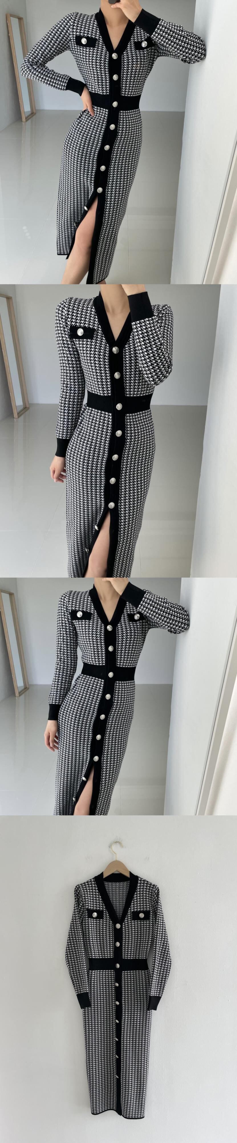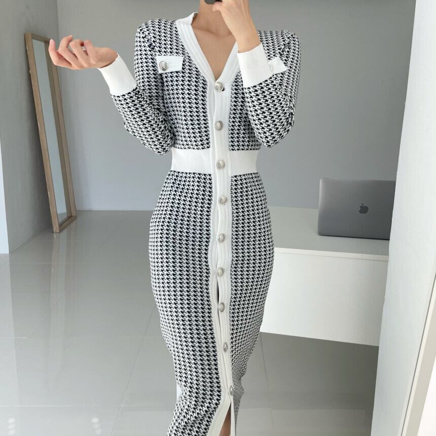オータムウィンタースタンダードカラーVネックスリムニットドレス レディース ロング レトロ 秋物 冬物 韓国婦人27146193449
