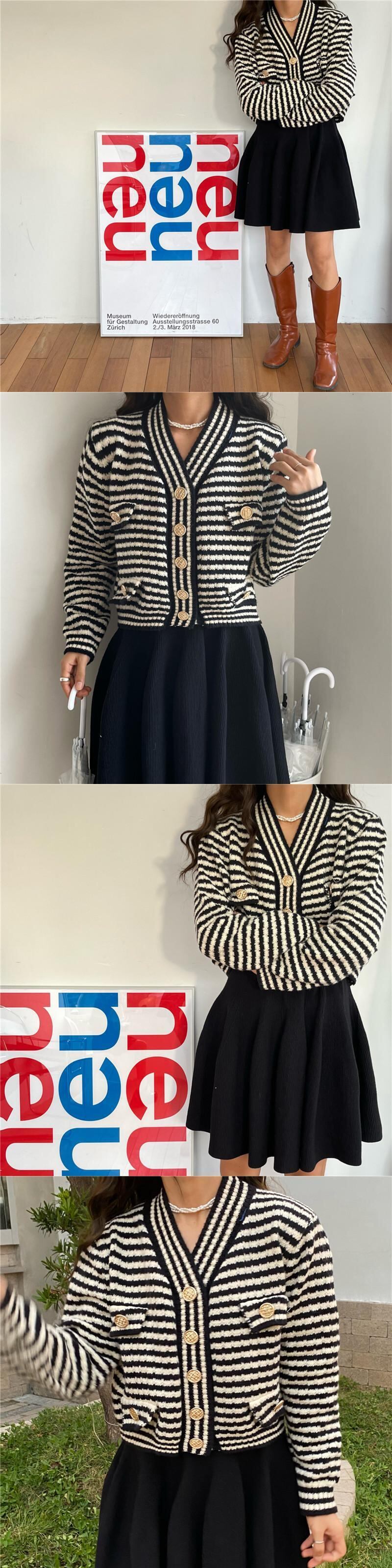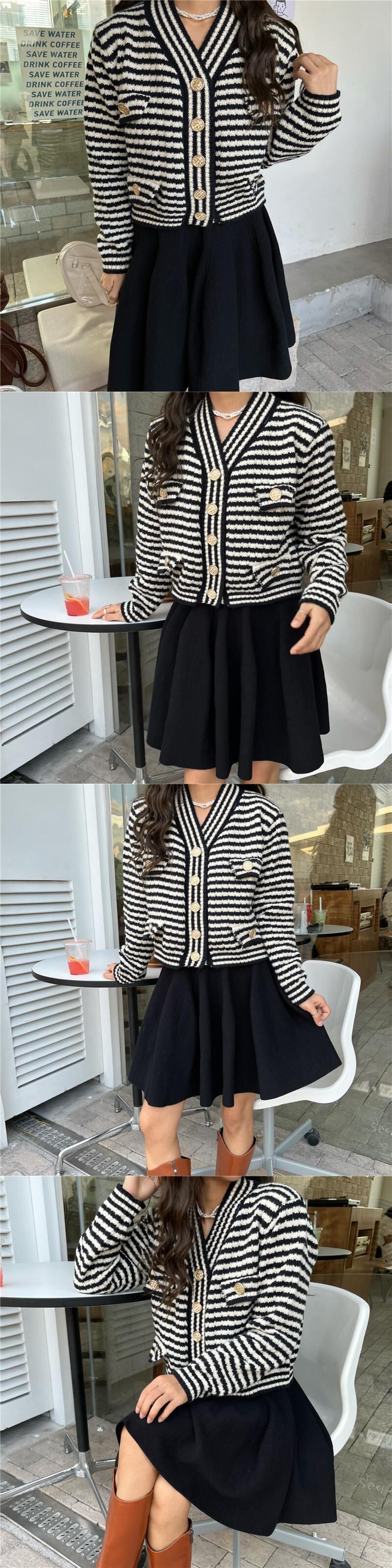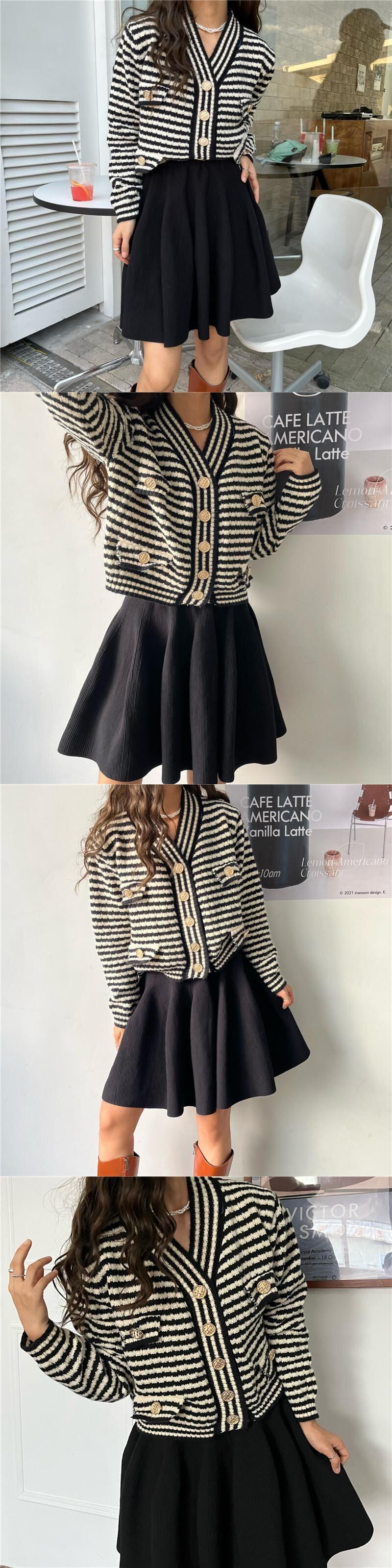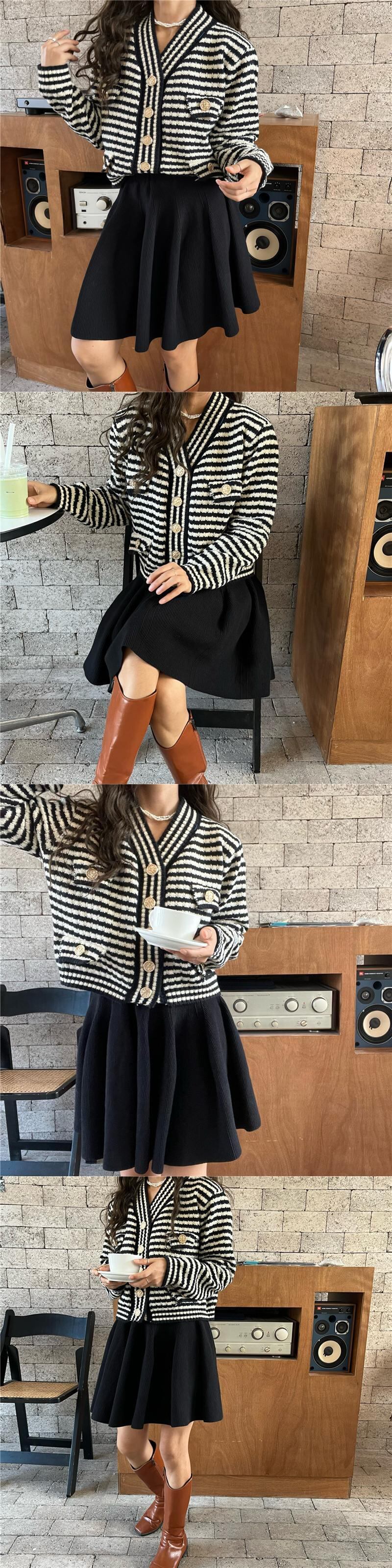 オータムスタンダードVネックストライプニットセーター カーディガンハイウェストプリーツスカート レトロ 秋物 韓国婦人86708033847