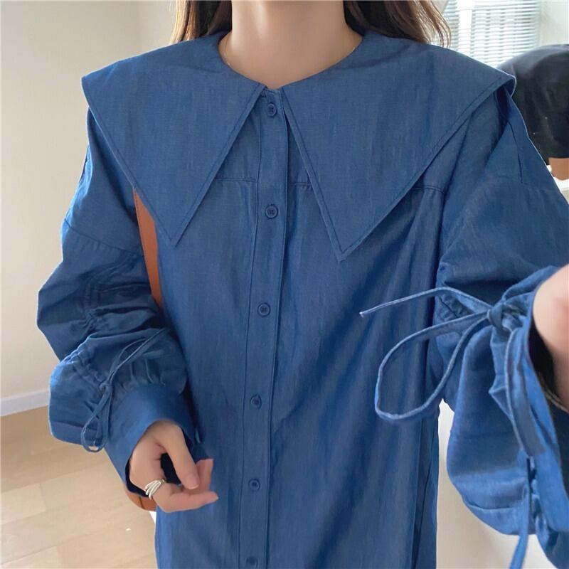 オータムスタンダードネイビーカラーギャザープリーツスリーブルーズドレス レディース レトロ 秋物 韓国婦人16205902527
