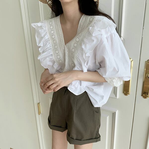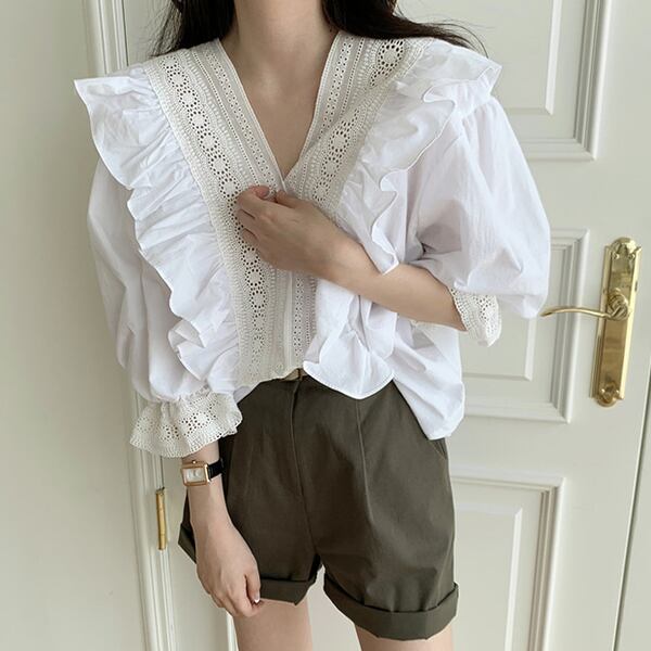 サマースタイルレースVネックシャツ トップス レディース 夏物 ステッチ 韓国婦人66021543984