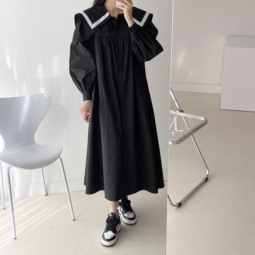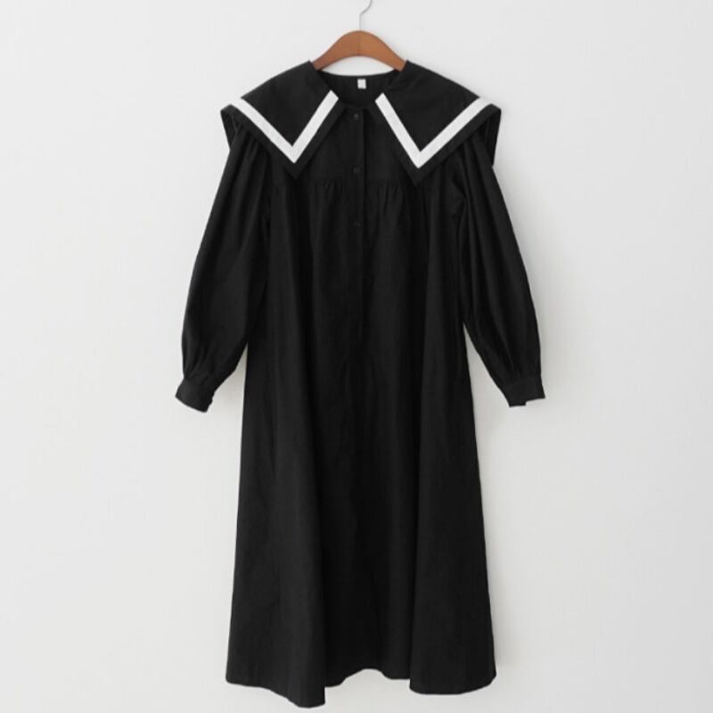 オータムウィンタースタンダードカラーネイビーシングルブレストルーズドレス レディース レトロ 秋物 冬物 韓国婦人71180369783