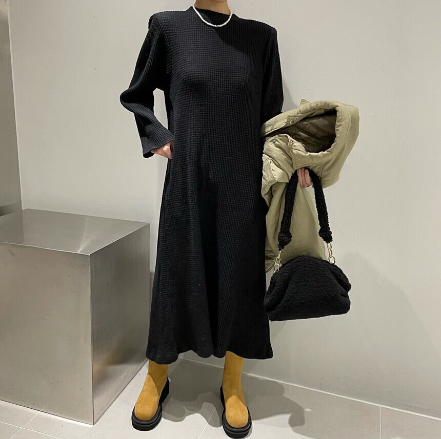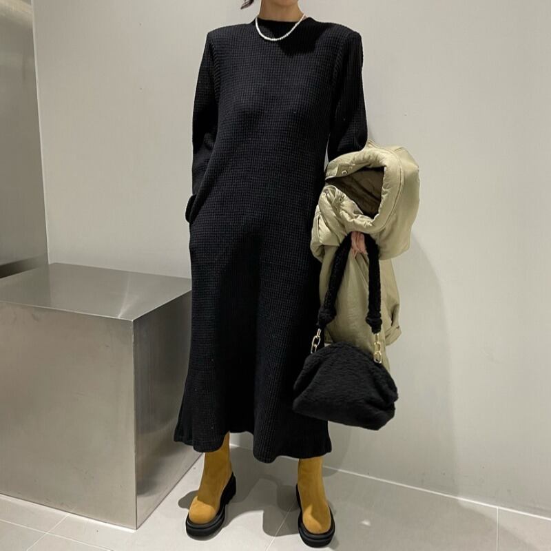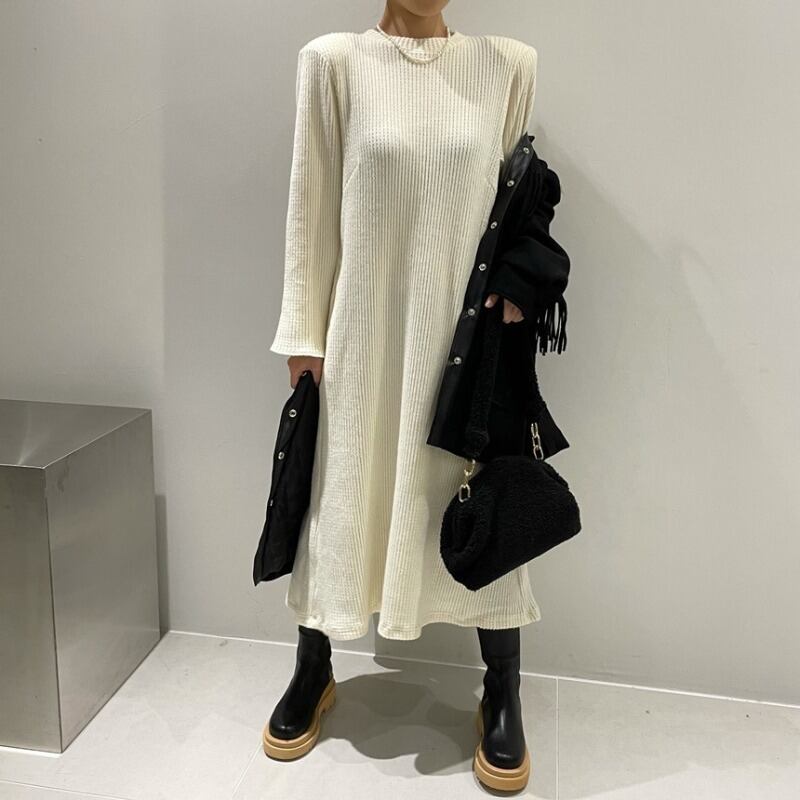 オータムウィンターラウンドネックバックスリットカジュアルルーズロングドレス レディース 秋物 冬物 Oネック 韓国婦人23279188023