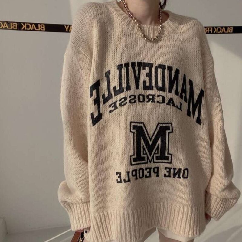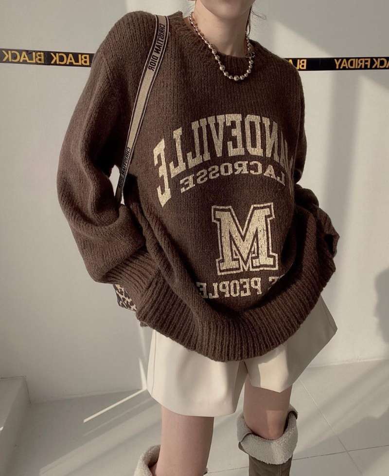 オータムウィンタースタンダードラウンドネックプリントルーズプルオーバー セーター レディース レトロ 秋物 冬物 Oネック 韓国婦人82325369717