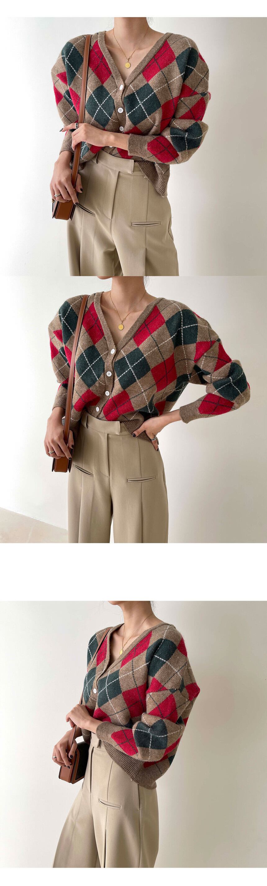 オータムウィンタースタンダードスタイルVネック格子柄カラーニットカーディガンセーター レディース ロング レトロ 秋物 冬物 韓国婦人11029791491