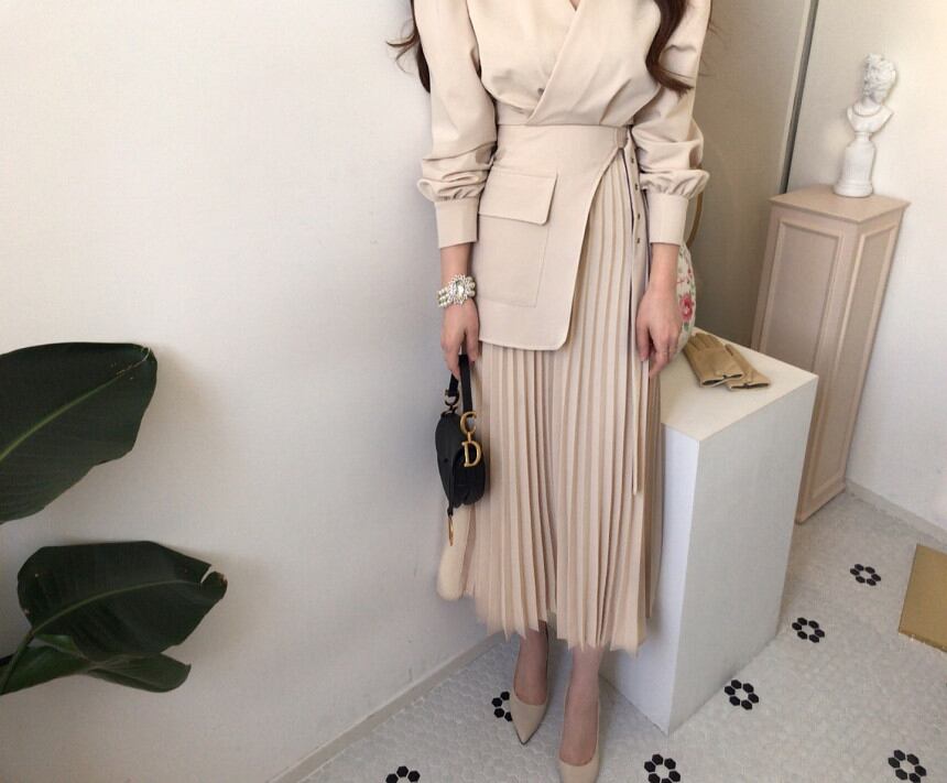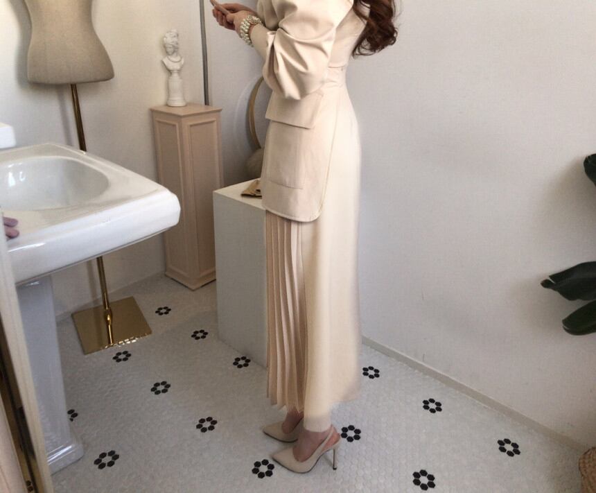 オータムVネックサイドバックルウェストプリーツスリーブロングドレス 秋物 ステッチ 韓国婦人64826510101