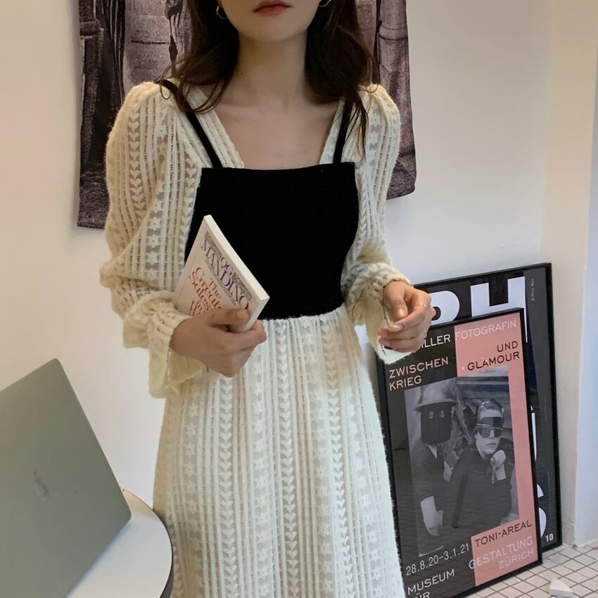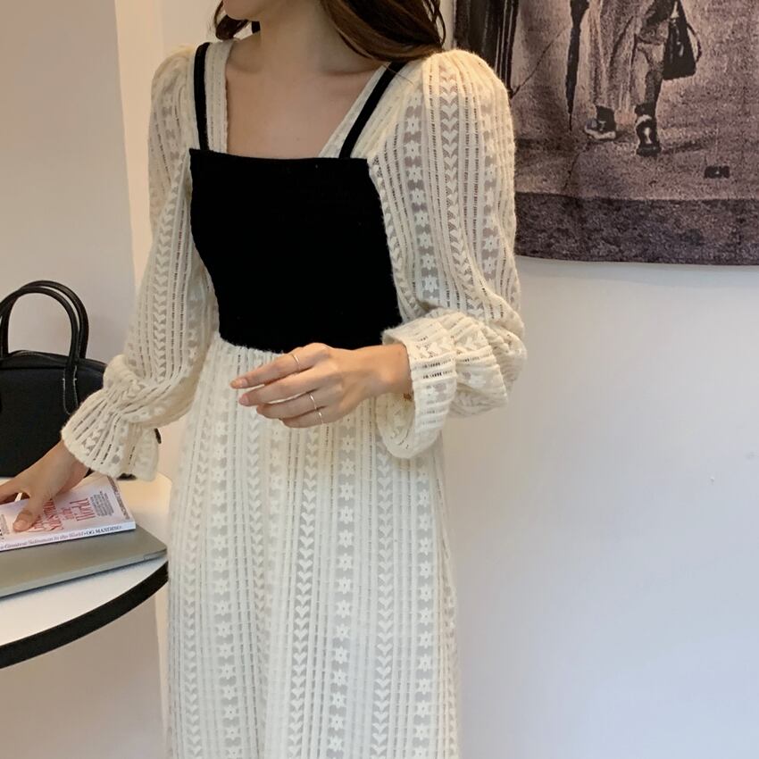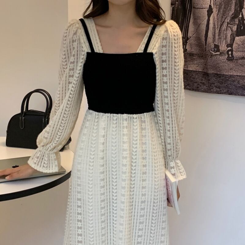 オータムベルベットレースドレス ロングスカート 秋物 スクウェア ステッチ 韓国婦人87209428688