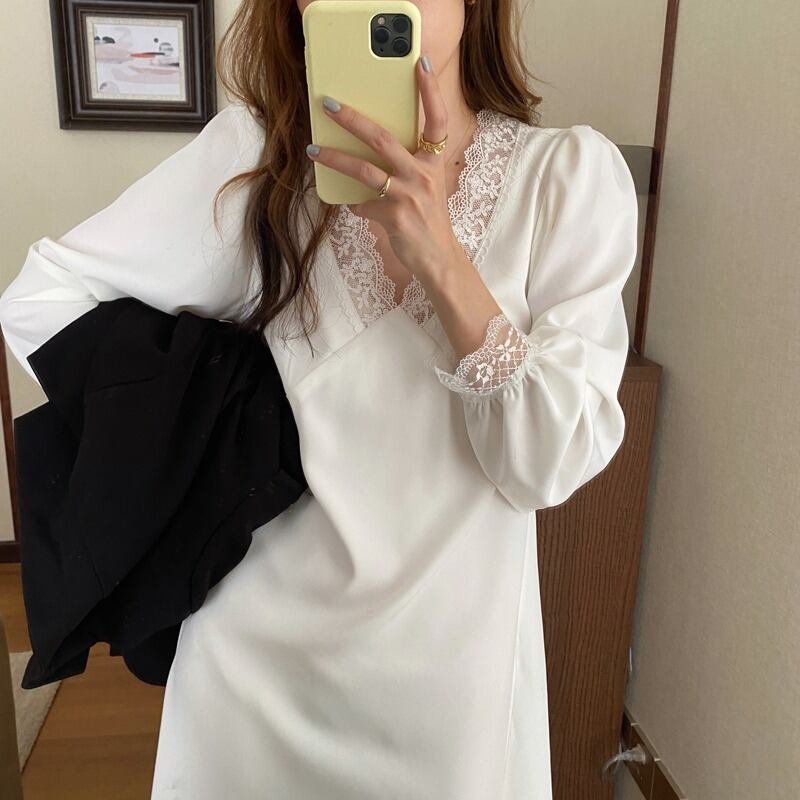 オータムレースVネックロングドレス スカート レディース 秋物 ステッチ 韓国婦人40063694922