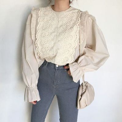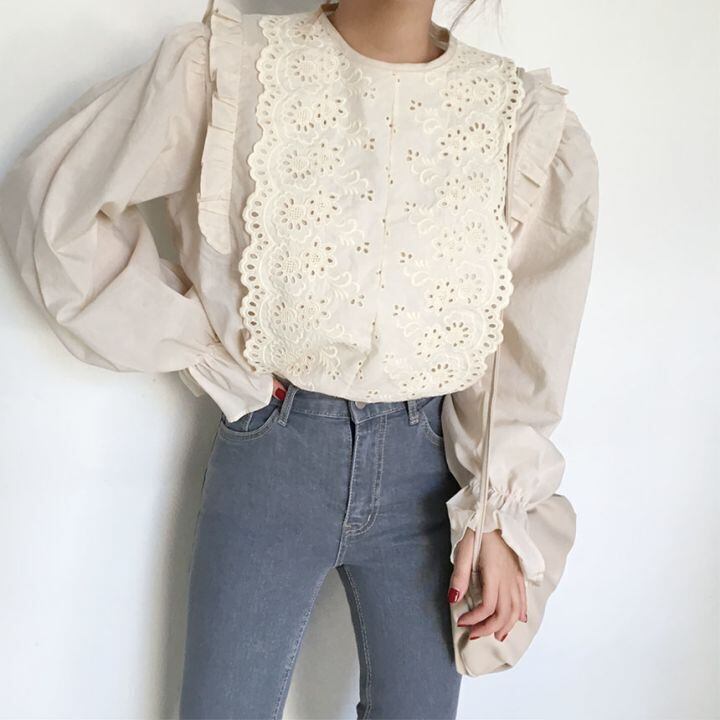オータムレーススリーブラウンドネックシャツ ブラウス レディース 秋物 Oネック ステッチ 韓国婦人46363848494