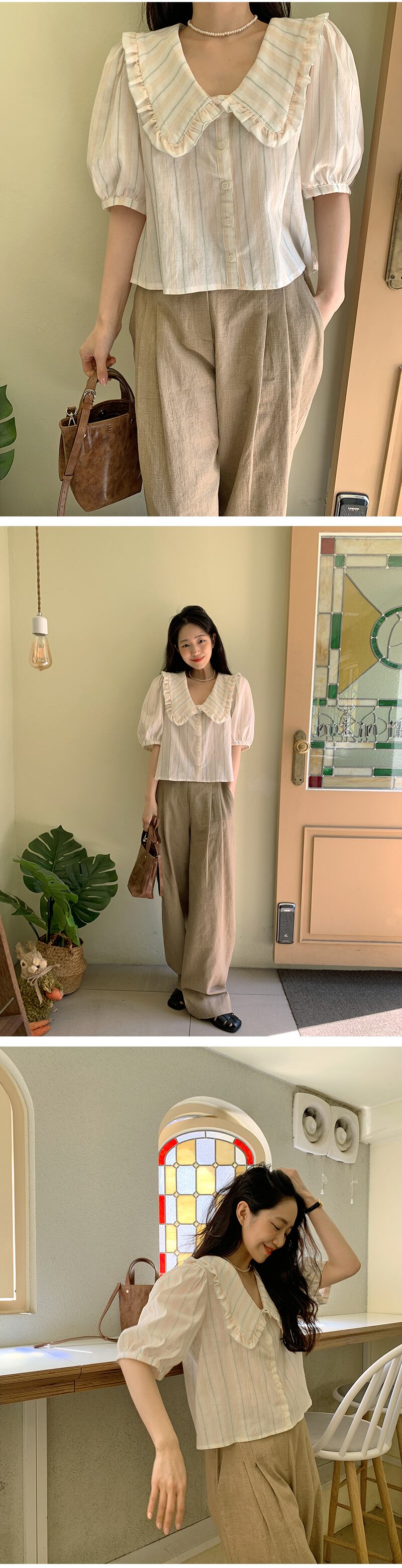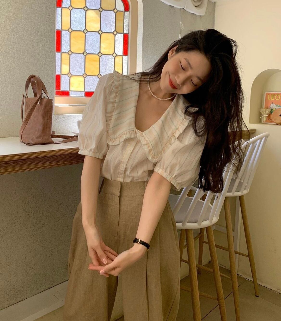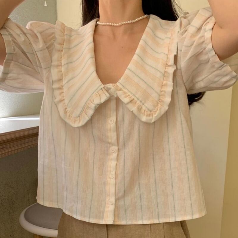 サイドカラーストライプシャツ レディーススタンダードルーズブラウス サマー レトロ 大人ガーリー スウィート キュート カジュアル 夏物 韓国婦人79263129630