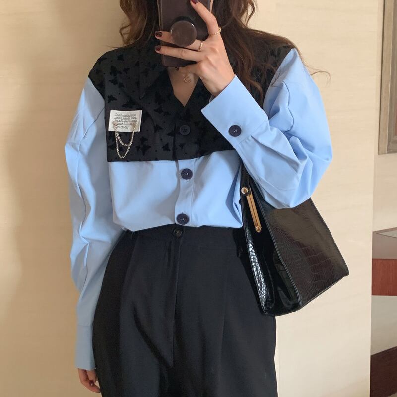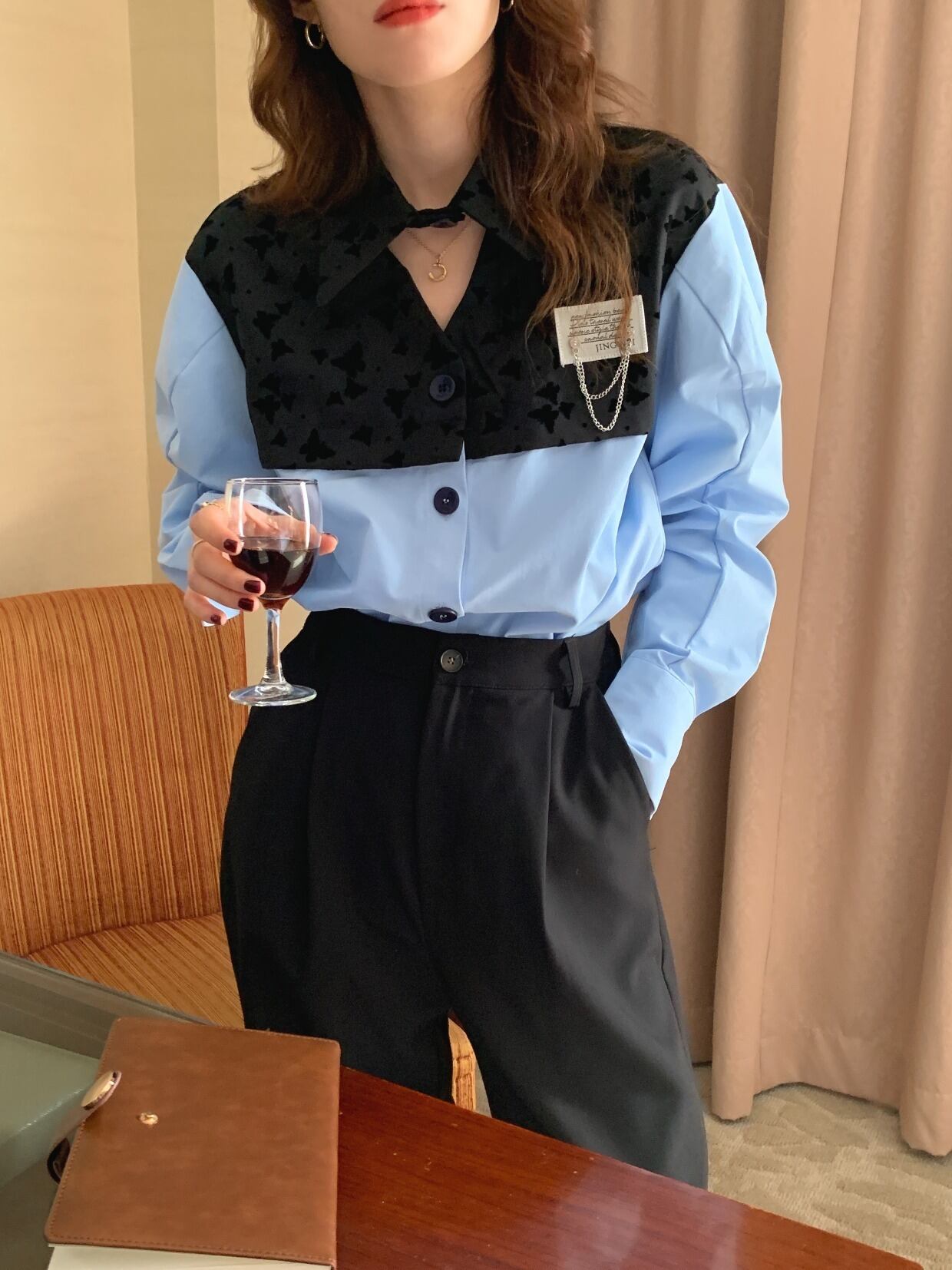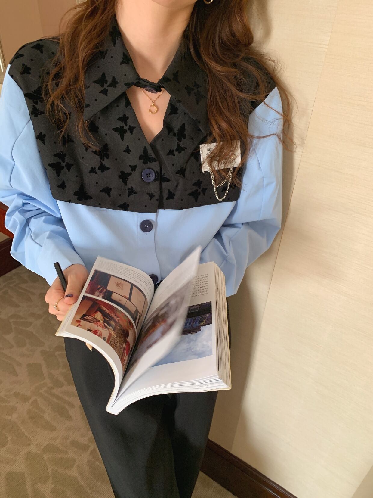オータムスタンダードButterflyデザイン カラーシャツ レディース ロング レトロ 秋物 ステッチ 韓国婦人82772328938