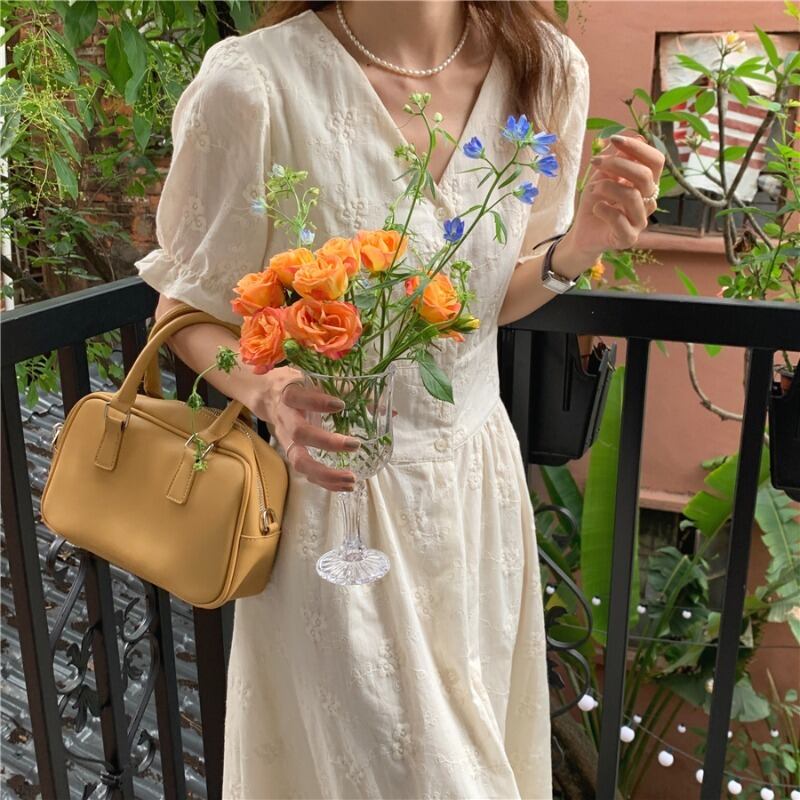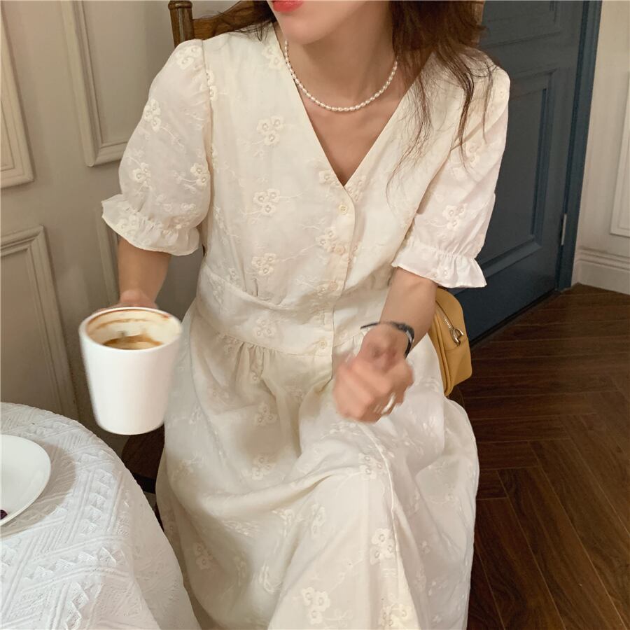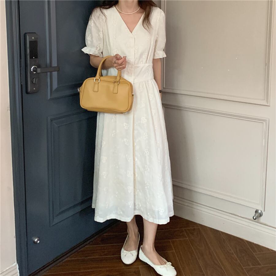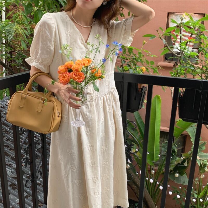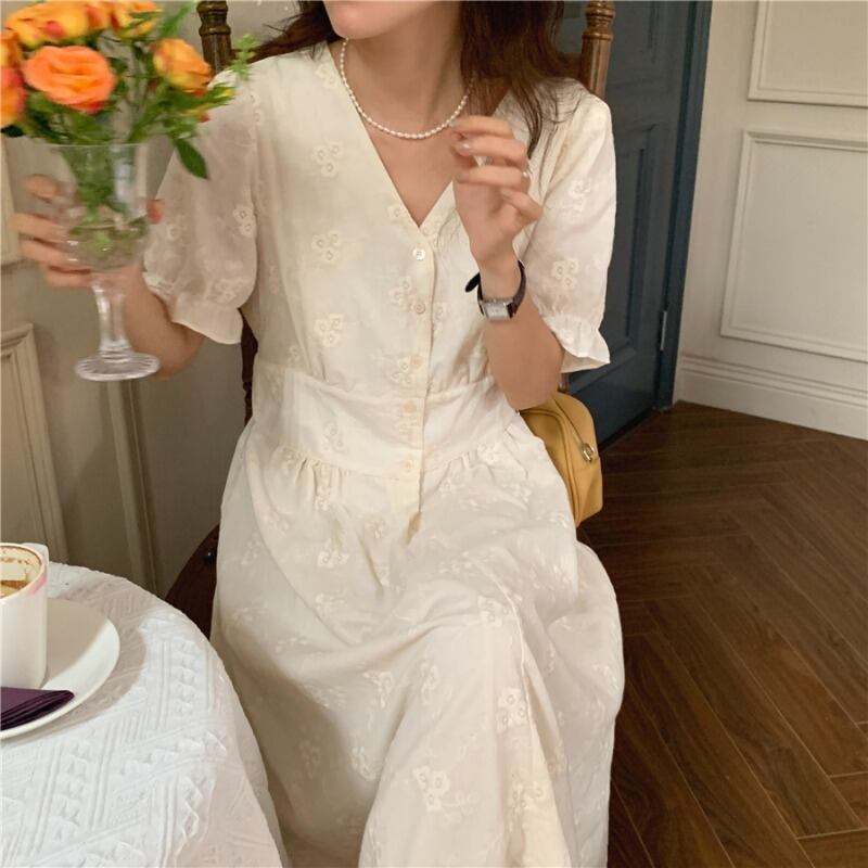 Vネック刺繍ウェストドレス サマーロングスカート 夏物 韓国婦人89236902230