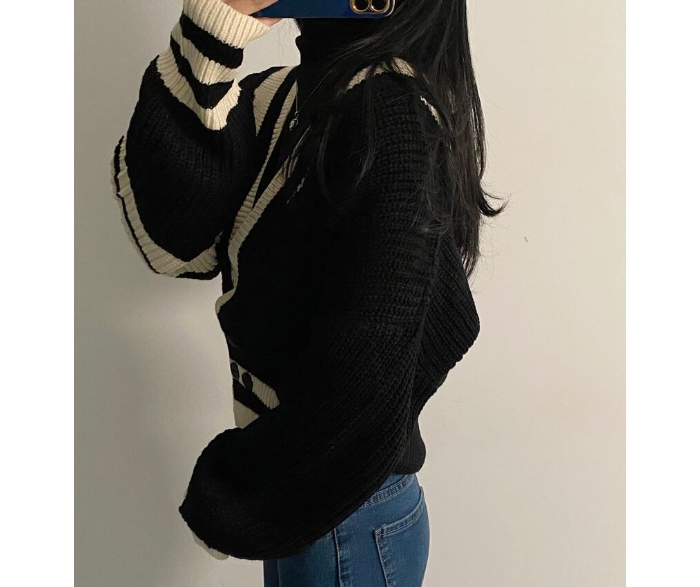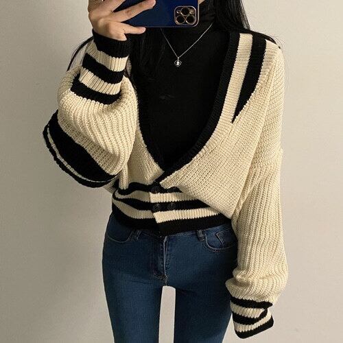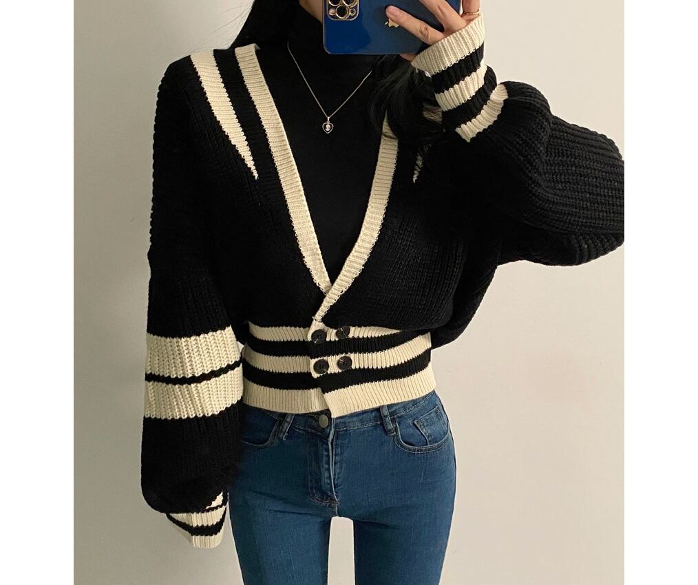 スタイルカラーVネックハイウェストウェストショートストライプセーター カーディガンレディース 韓国婦人50481465221