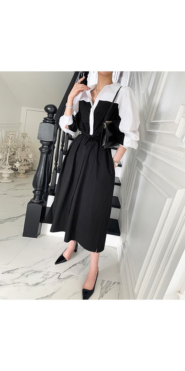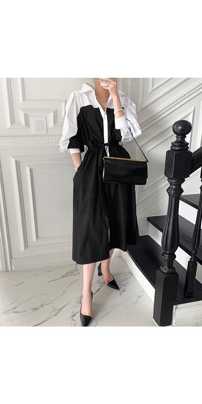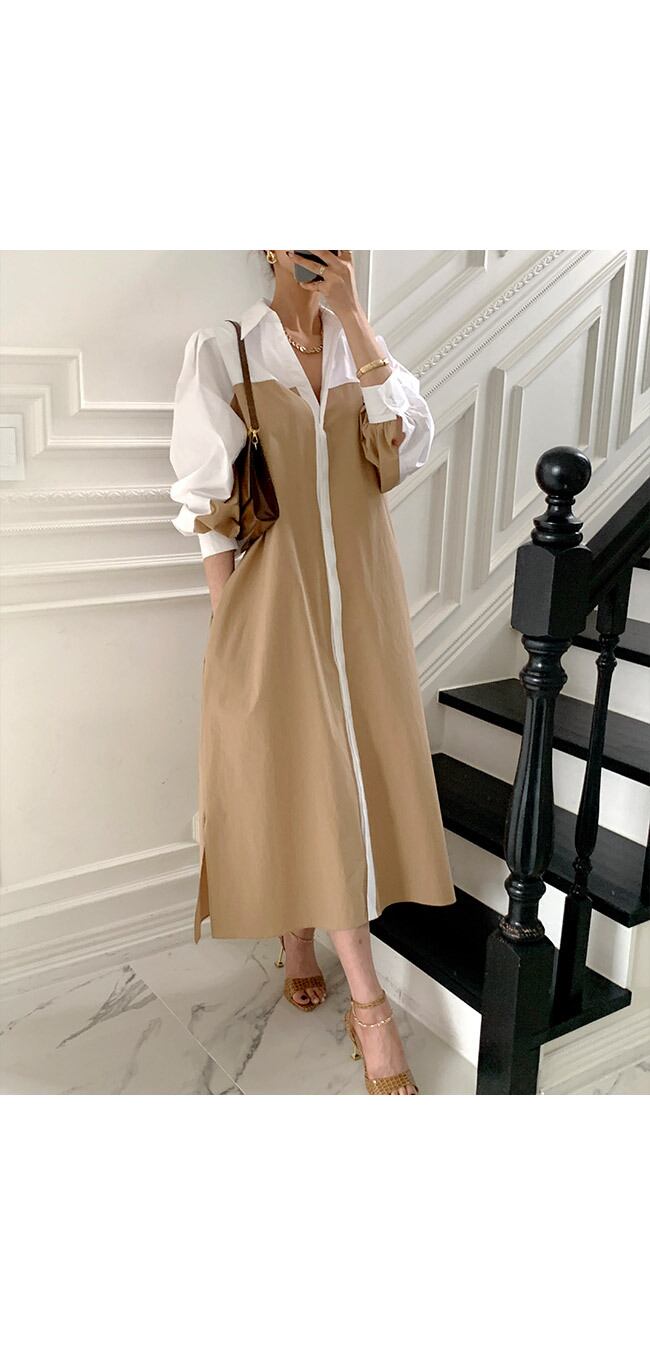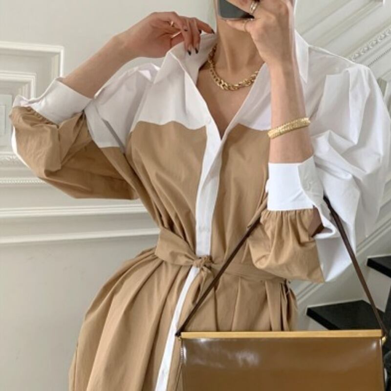 スタンダード薄手ロングルーズシャツ ドレス レディース レトロ ステッチ 韓国婦人24383489382