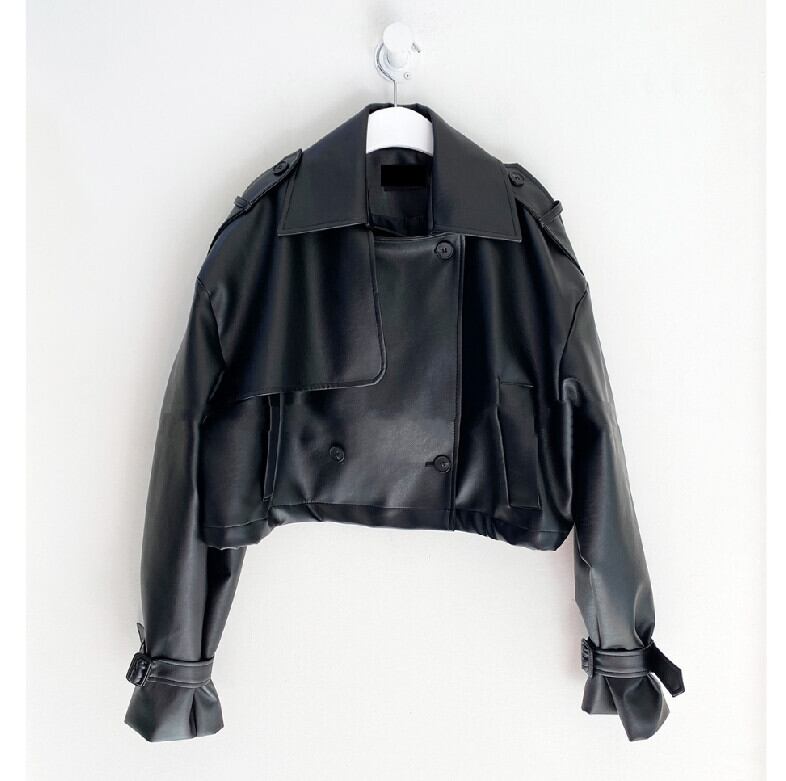オータムスタンダードカラーダブルブレストカジュアルルーズショートレザージャケット レディース レトロ ストリート 秋物 韓国婦人85184051057
