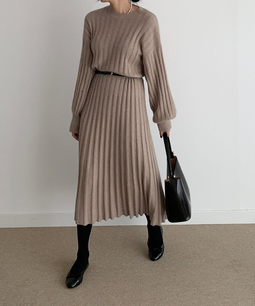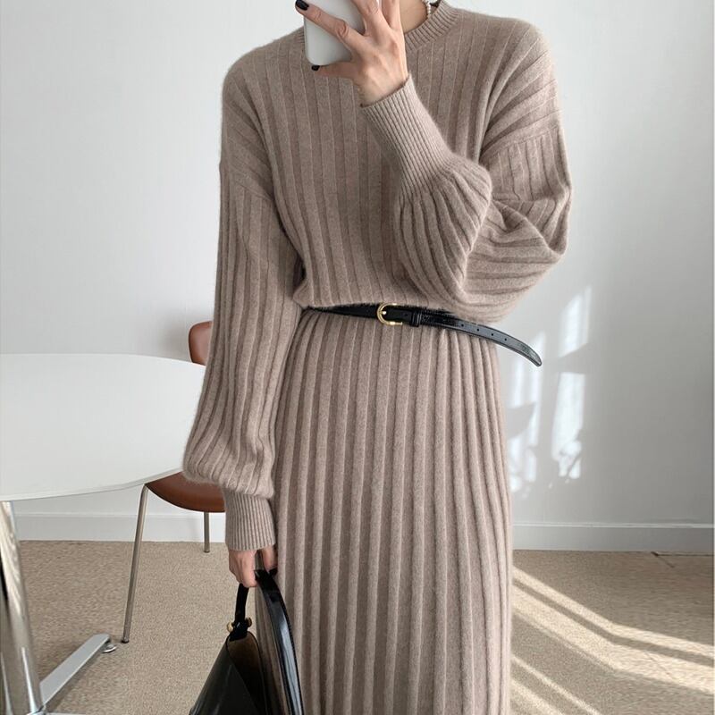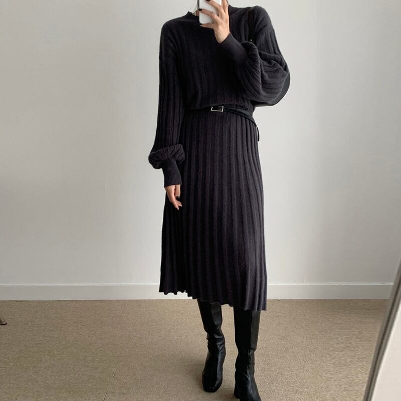 オータムウィンタースタンダードラウンドネックスリーブルーズロングプリーツニットセーター ドレス レディース ランタンスリーブ レトロ 秋物 冬物 Oネック 韓国婦人86201729476