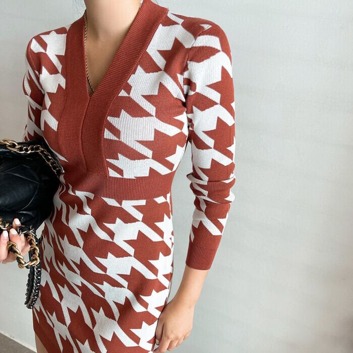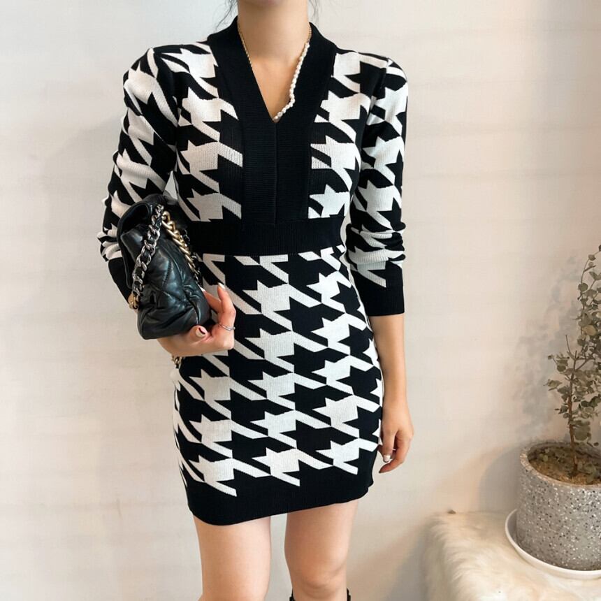オータムウィンタースタンダードVネックスリムショートニットドレス セーター スカート レディース レトロ 秋物 冬物 韓国婦人40140780624