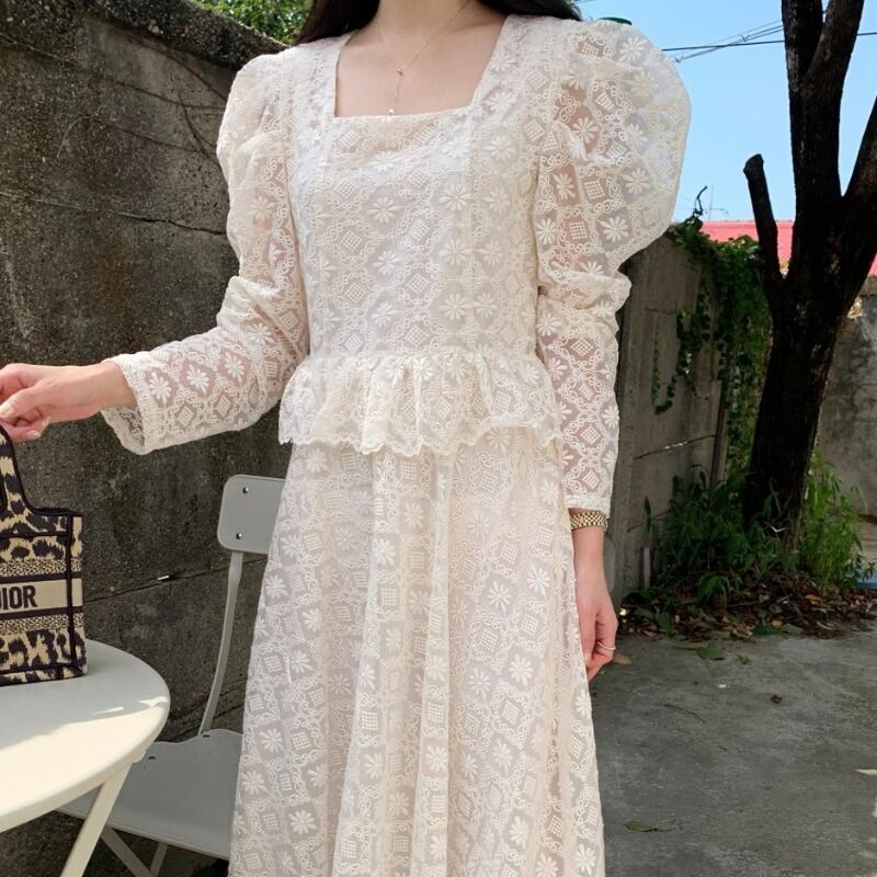 オータムカラーウェストスリーブロングレースドレス レディース エレガント 秋物 スクウェア 韓国婦人49700379680