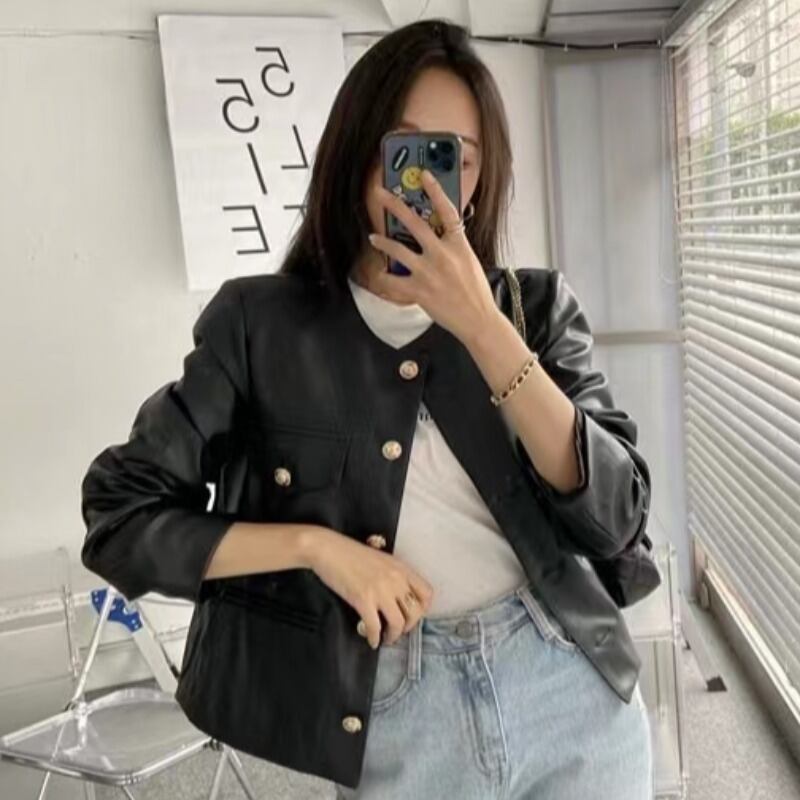 オータムウィンターメタルバックルカジュアルルーズショートレザージャケット レディース 秋物 冬物 韓国婦人82684017204