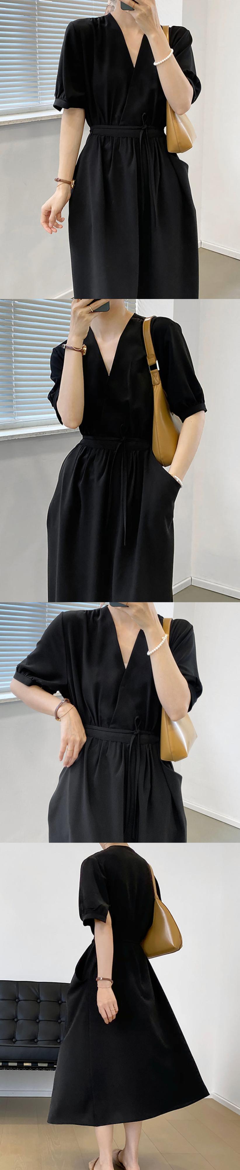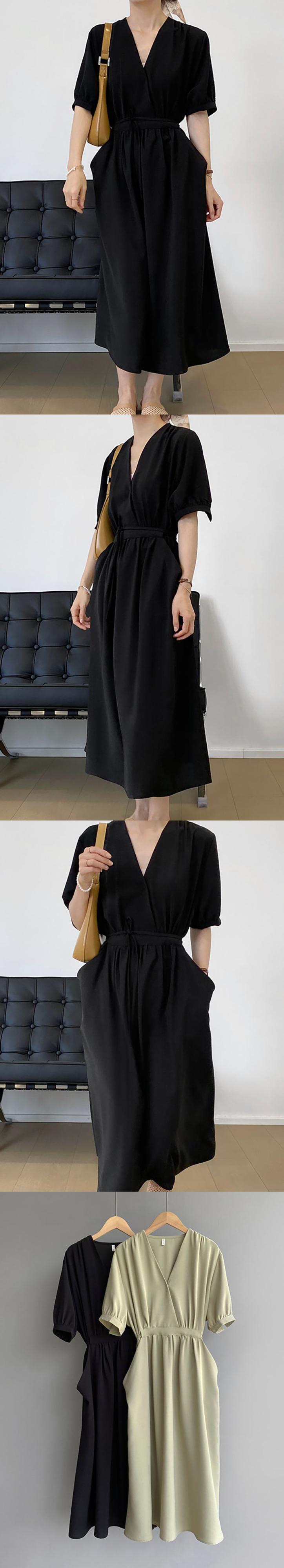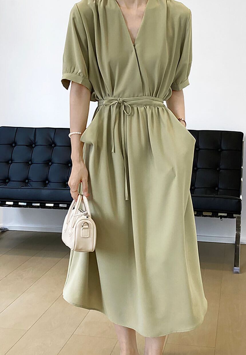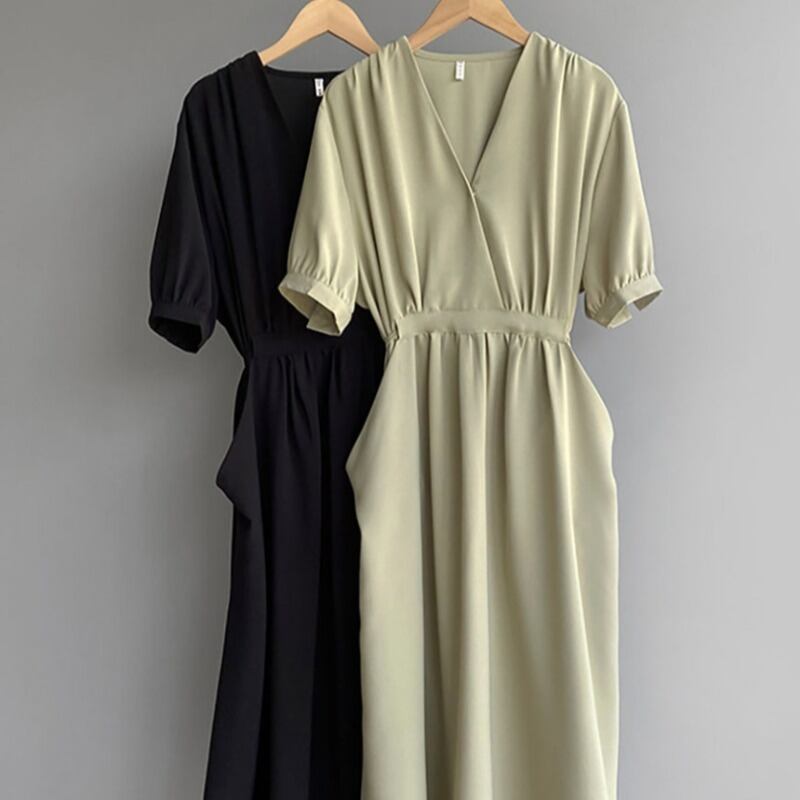 サマースタイルVネックウェストダブルポケットロングドレス レディース エレガント 夏物 韓国婦人7486642119