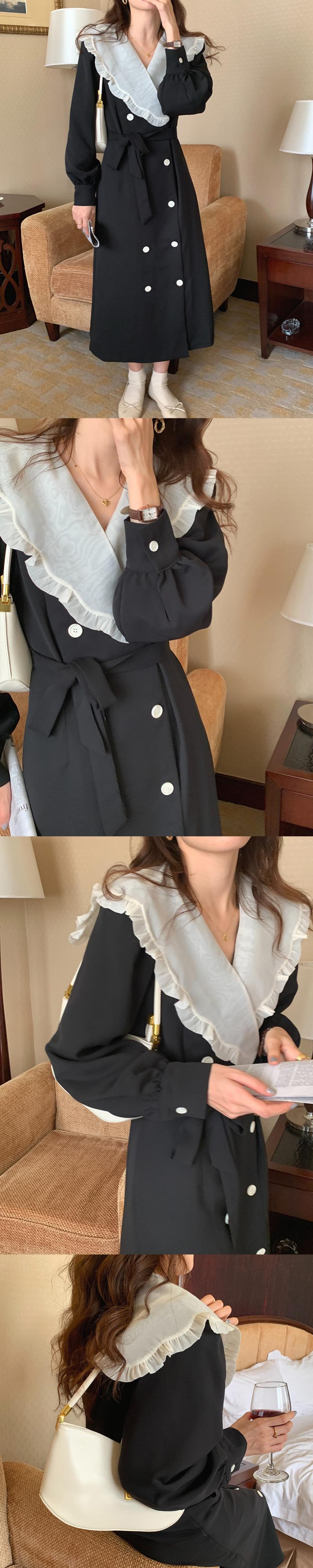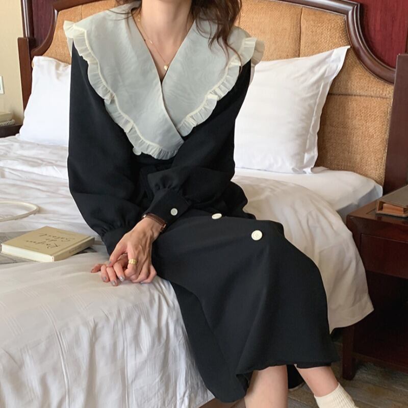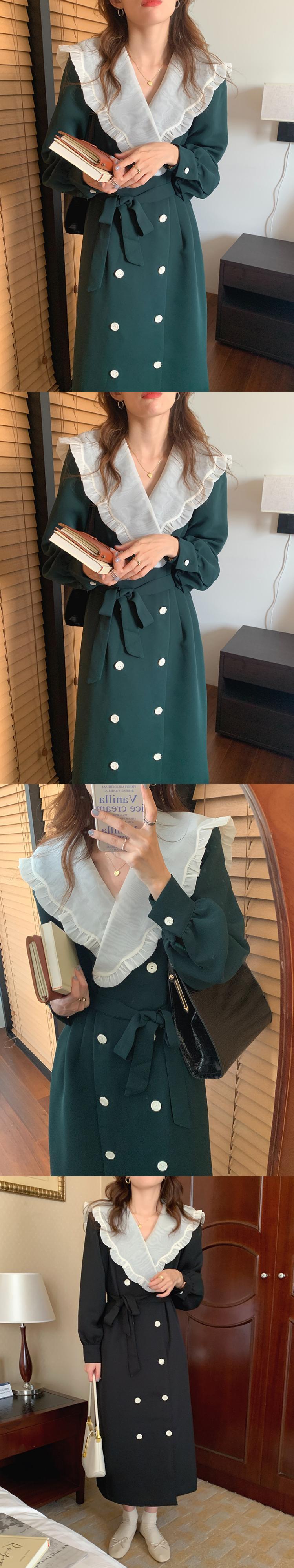 オータムウィンタースタンダードカラーサイドダブルブレストウェストドレス レディース ロング レトロ 秋物 冬物 韓国婦人17675493451