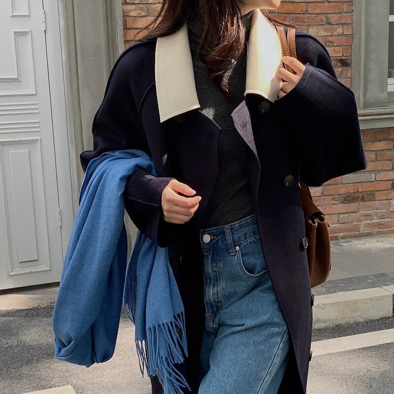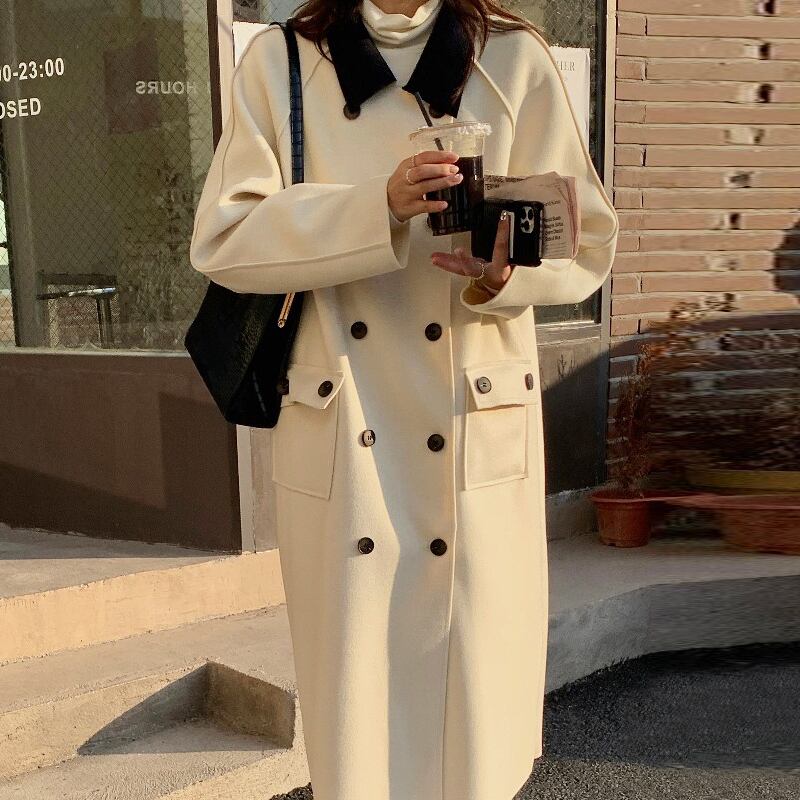 ウィンタースタンダードカラーダブルブレストロングコート ジャケット レトロ 冬物 韓国婦人14985042736