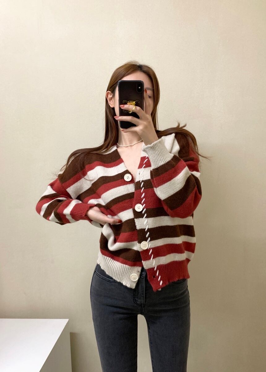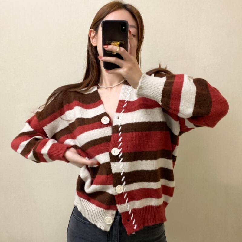 ウィンタースタンダードカラールーズストライプセーター カーディガンジャケット レディース レトロ 冬物 ステッチ 韓国婦人89056863815