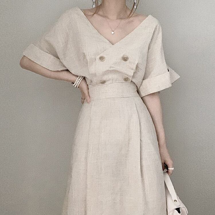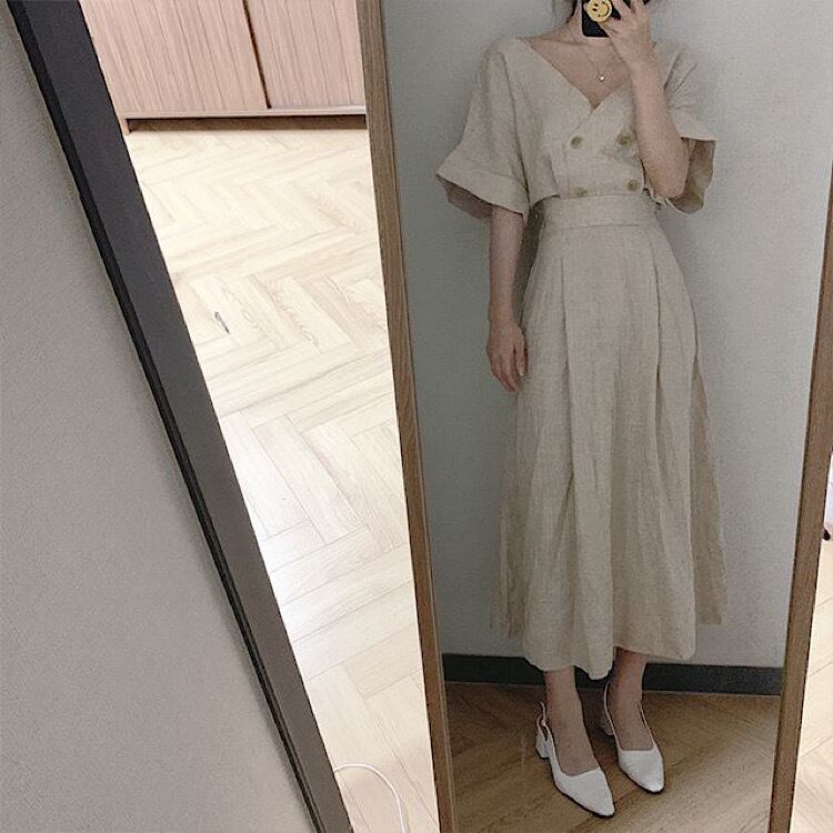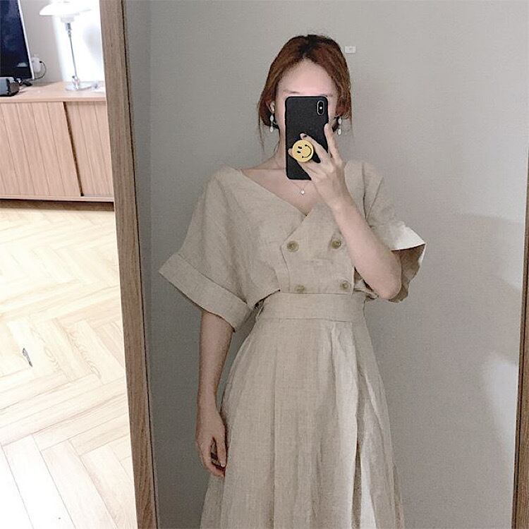 Vネックダブルブレストウェスト薄手ドレス サマースカート コットン 夏物 韓国婦人16878402291