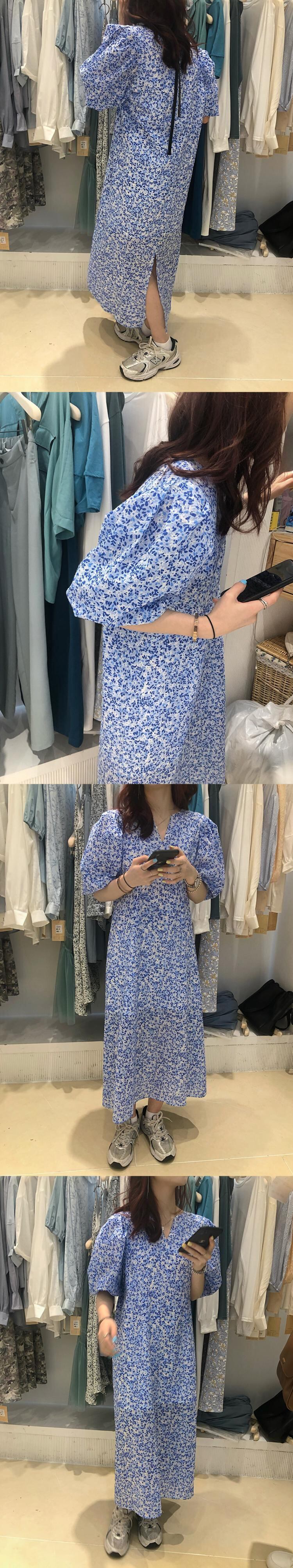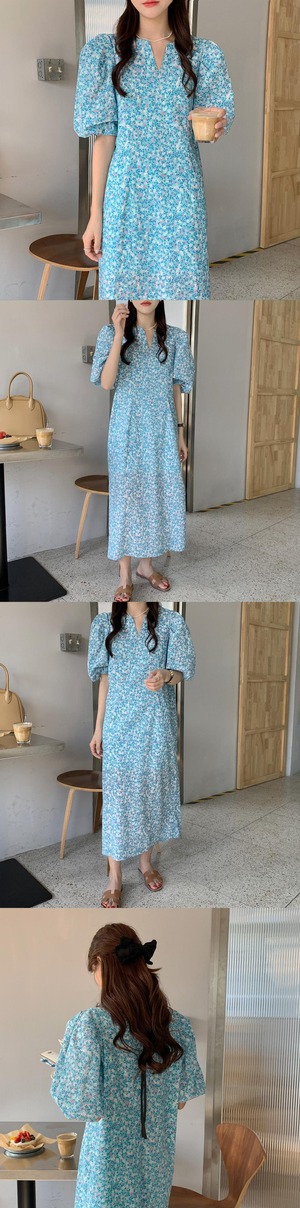 サマーブルーフローラルVネックスリーブドレス バックシフォンロングスカート 夏物 花柄 韓国婦人39349964484