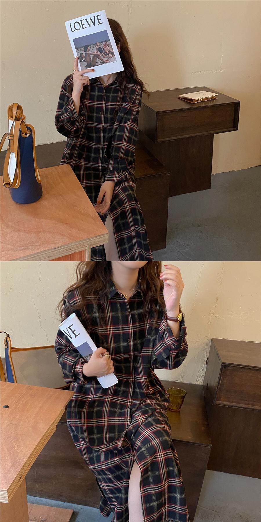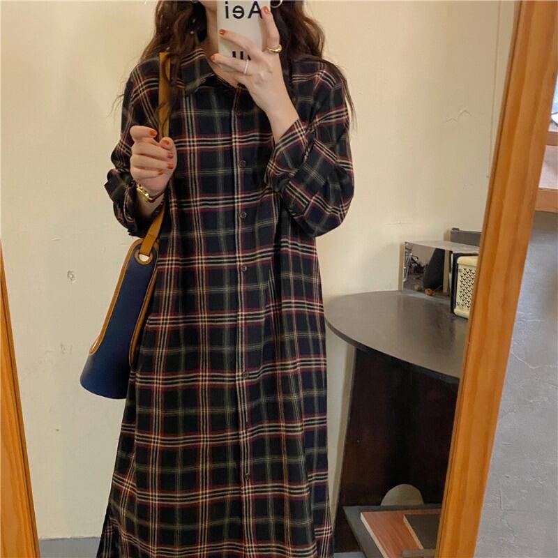 オータムスタンダードカジュアルルーズロング格子柄シャツ ドレス レディース レトロ 秋物 韓国婦人65673548418