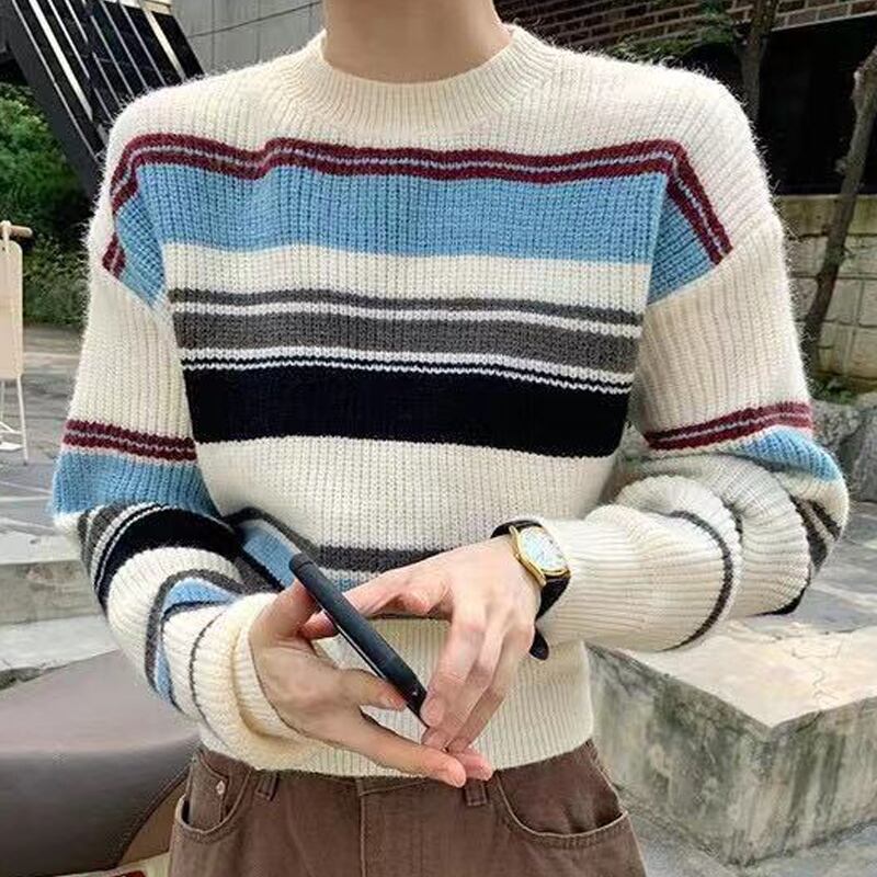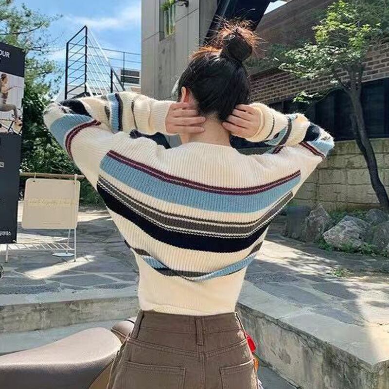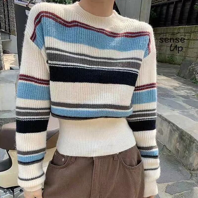 オータムウィンタースタンダードスタイルウェストショートカラーストライプラウンドネックニットセーター レディース レトロ 秋物 冬物 Oネック 韓国婦人76498047778