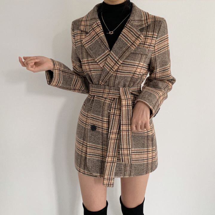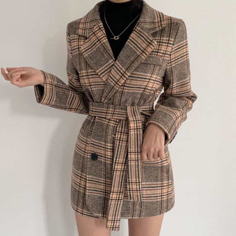 オータムウィンタースタンダードバックルウェスト格子柄コート レディース レトロ 秋物 冬物 韓国婦人86793225848
