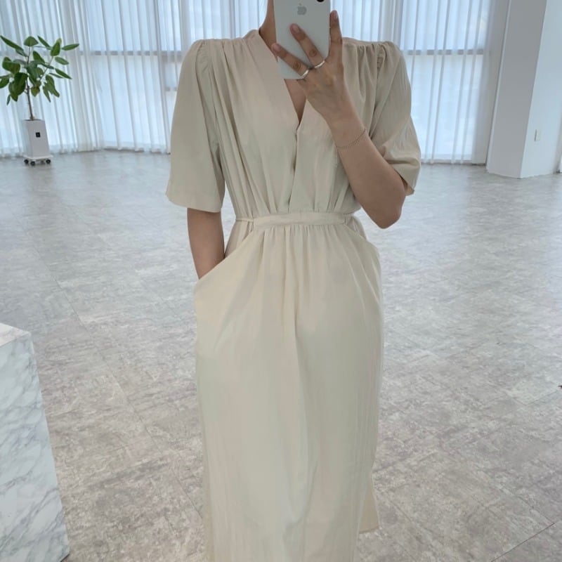 サマーVネックストラップ ウェストポケットロングドレス レディース 大人ガーリー スウィート キュート カジュアル 夏物 韓国婦人43198581147